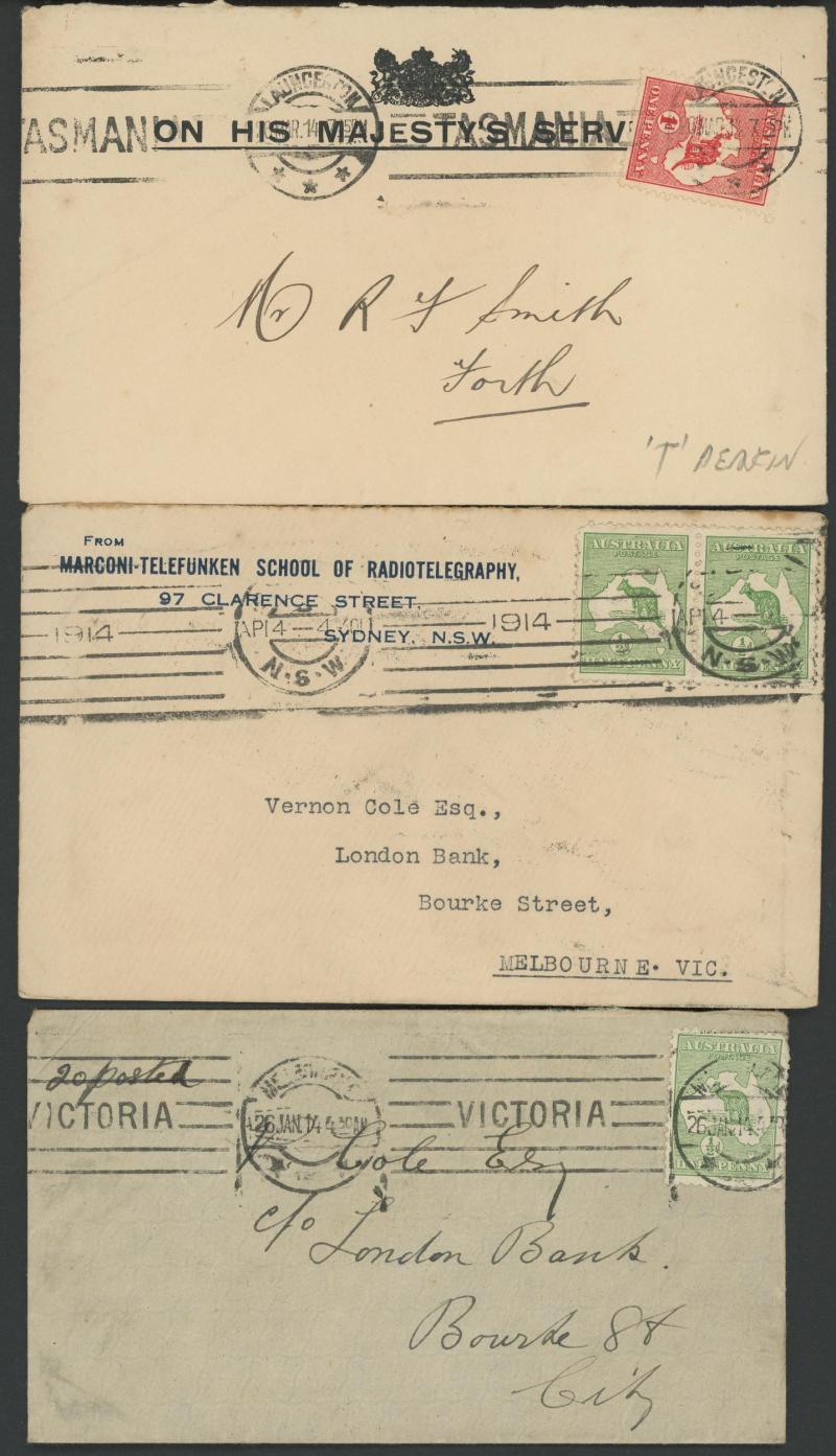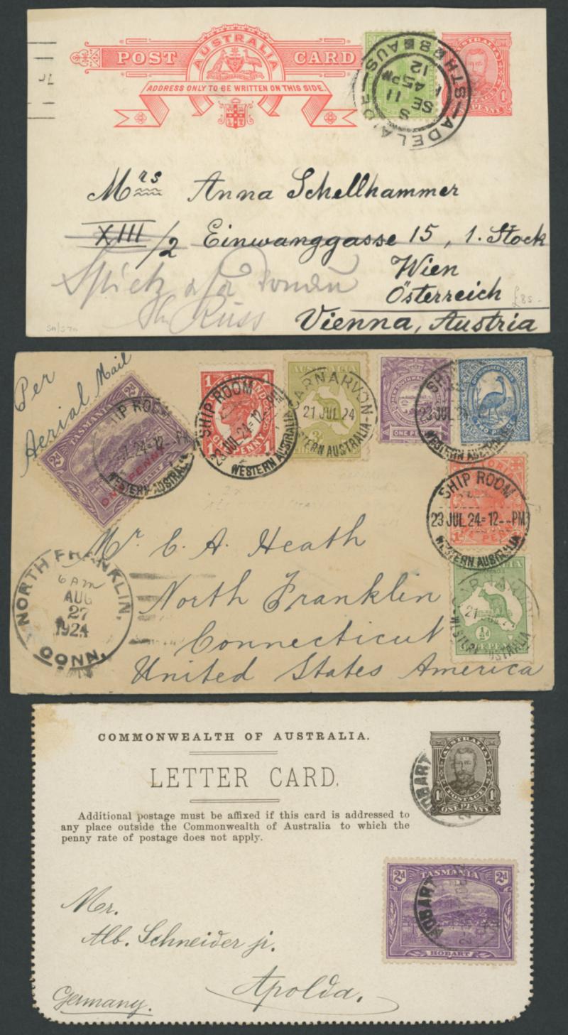 commercial usage from South Australia, Letter Card from Tasmania, 1912 with stamps of all States, 1919 Melbourne dealer's cover with Kangaroo ½d green coil stamp + WA 'ONE PENNY' on 2d, and 1924 with Kangaroo ½d & 3d + stamps of NSW Queensland