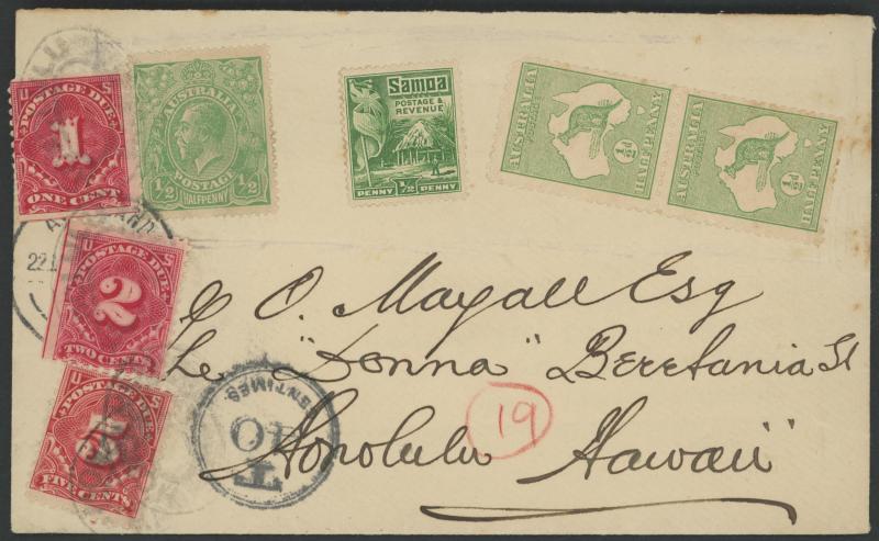 Taxed Mail group including 1921 to England with KGV 4d orange solo and Great Britain Postage Dues 2d pair (envelope with some