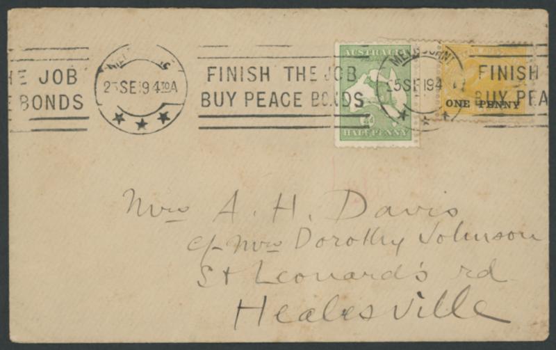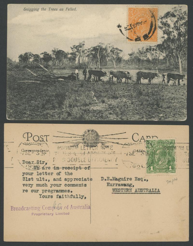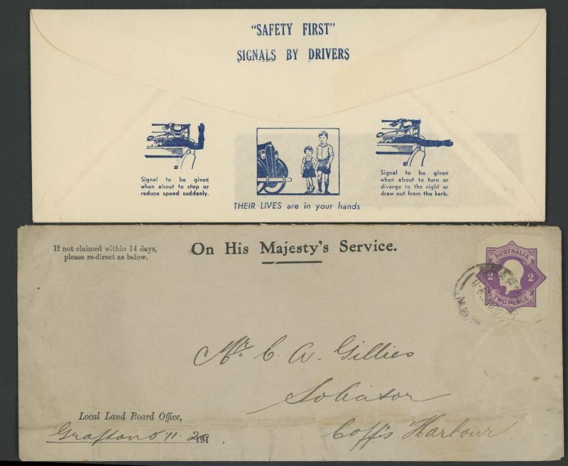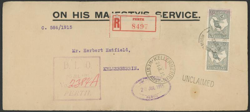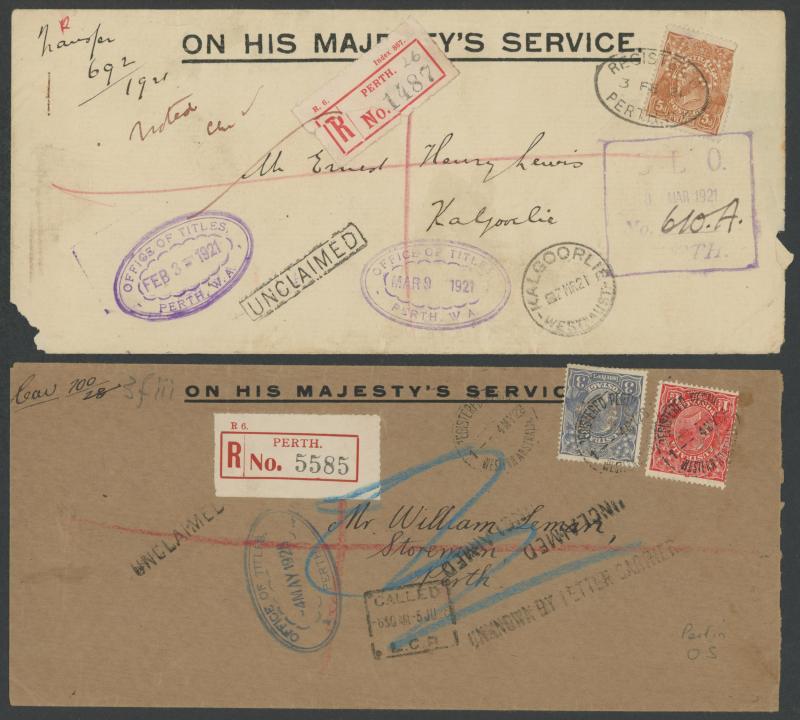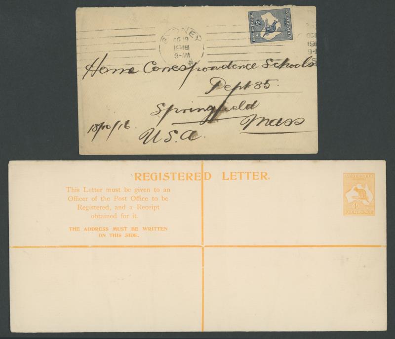 lettersheet, WA Titles Office with 4d orange, 4d yellow-orange or 5d x2, 5d punctured 'VG' (very scarce on cover), others including 9d airmail rate postcard to GB with ½d orange & AIF 6d, etc, 1915 1d scenic Letter Card to USA with ½d green & 1d red