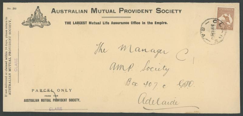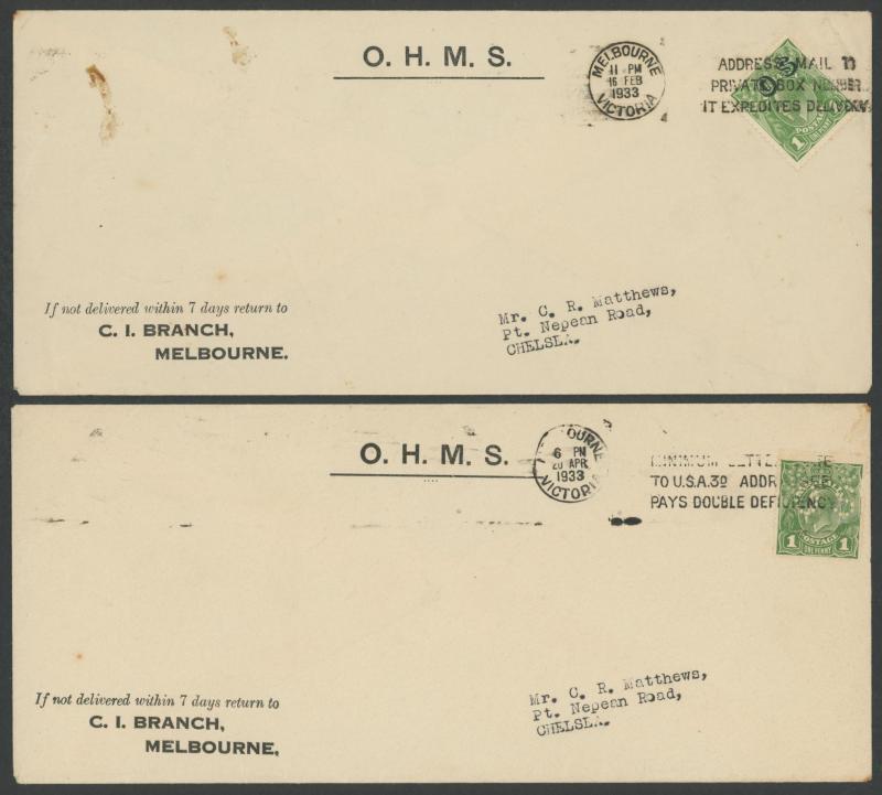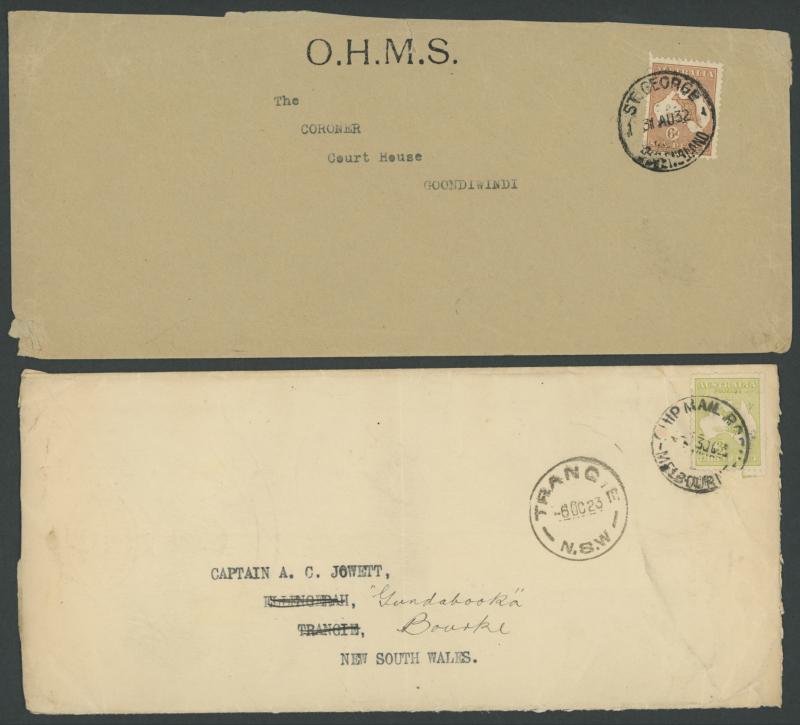 Commercial covers with Kangaroo frankings including ½d solo x2, 1d for redirection fee on envelope from GB, 2d punctured Small 'OS'