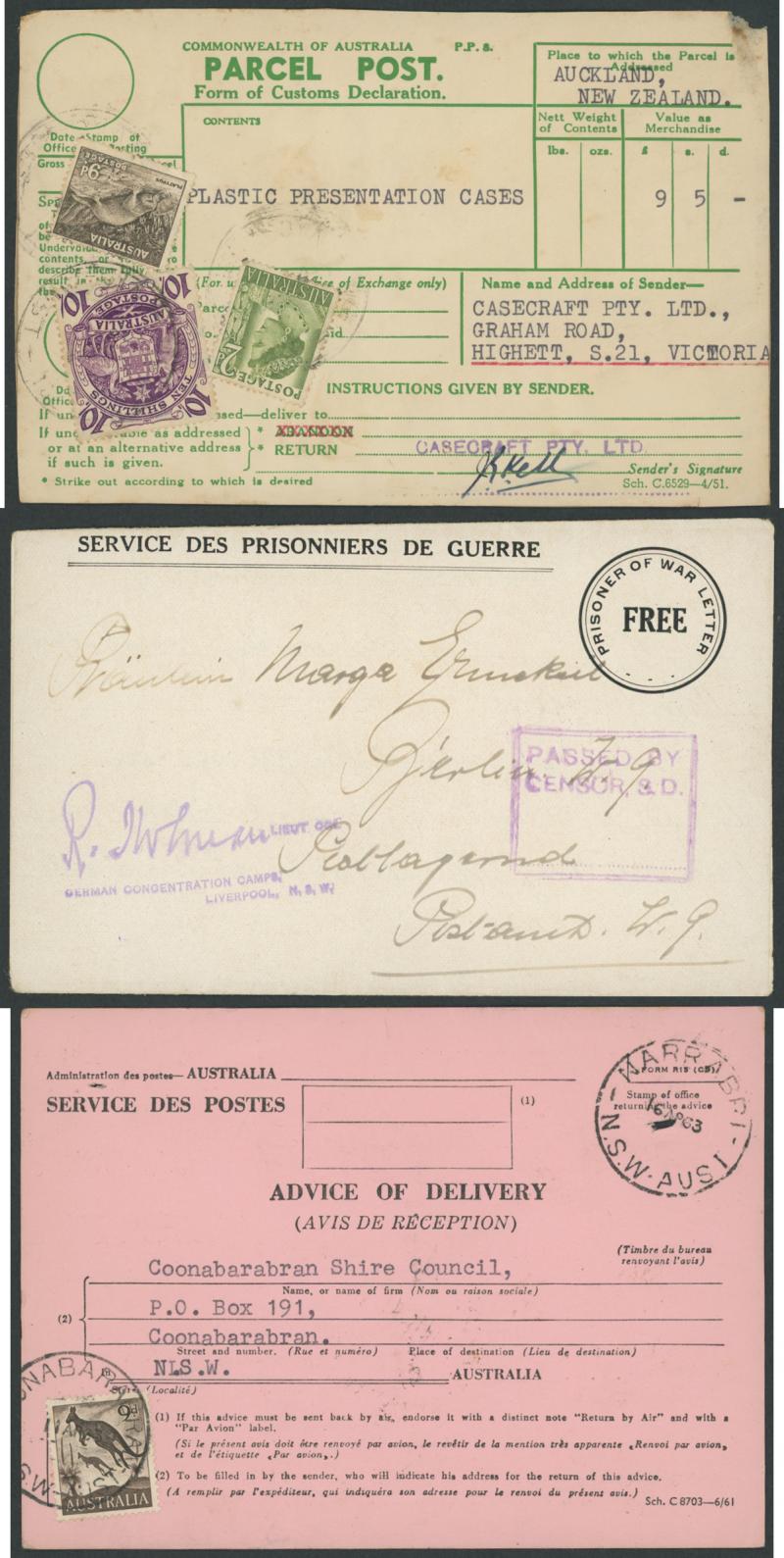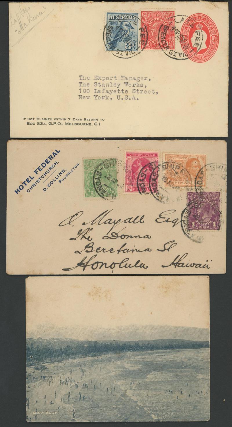 label to NZ with 1d 9d & 10/- Arms, 1962 & 1963 AR cards each with 9d brown Kangaroos, various OHMS envelopes, etc, one of 1920 with KGV Star 2d violet cutout, other cutouts on 17 commercial or philatelic covers, taxed covers including with Postage