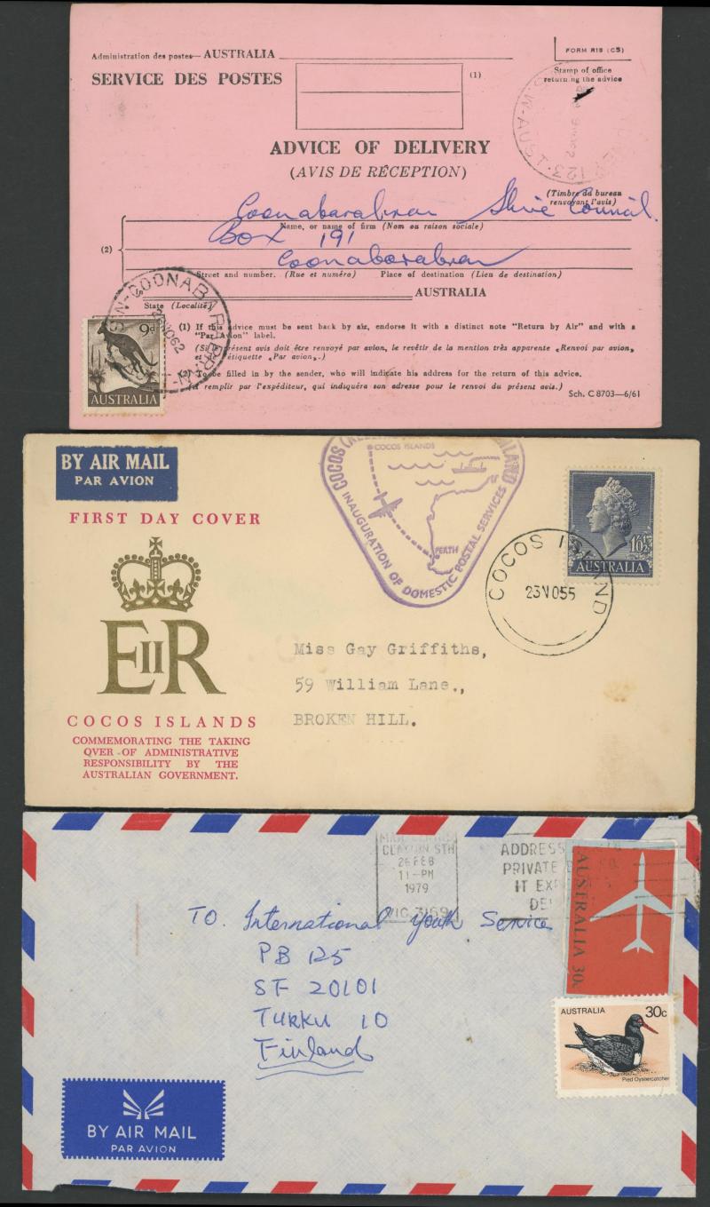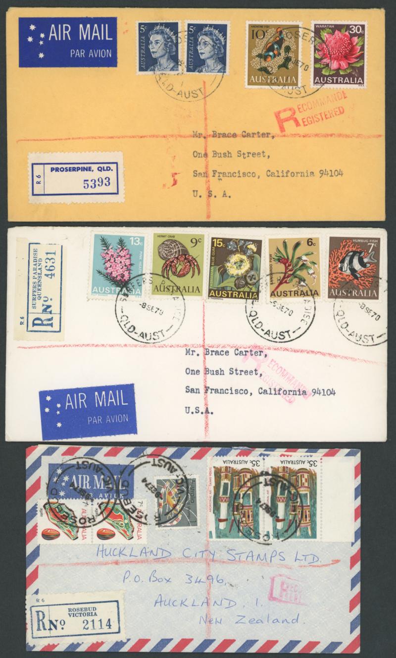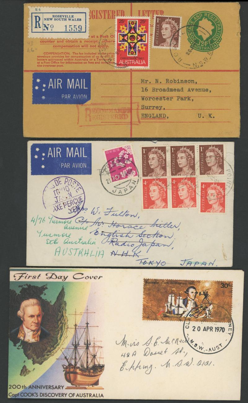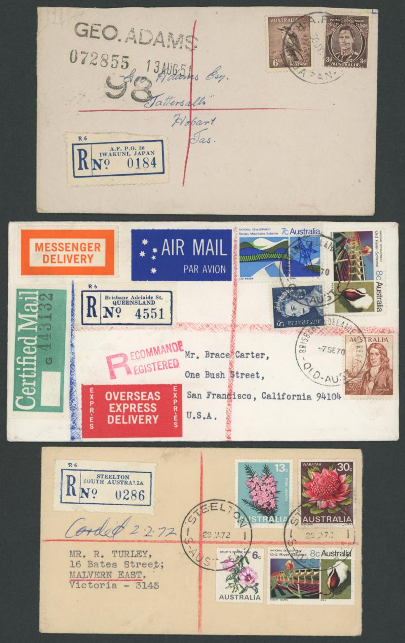 matching cds, 1951 BCOF/Korean War airmails to Tatts with 'A.F.P.O. 30/IWAKUNI, JAPAN' labels and 'A.F.P.O. No.30/JAPAN' cds x2, 1968 registered airmail to USA with 10c Fish & 30c Birds, etc, condition generally fine to very fine.
