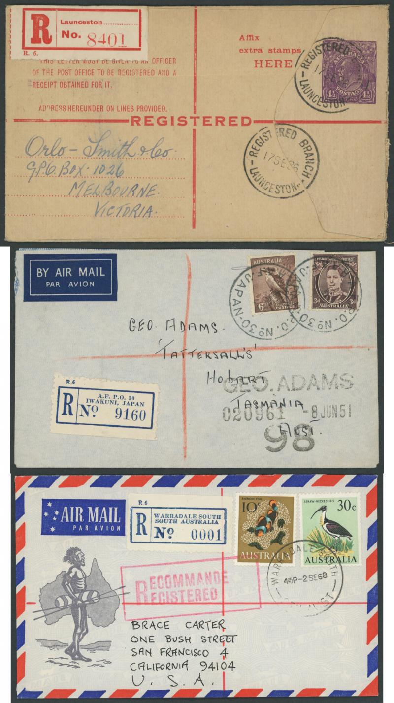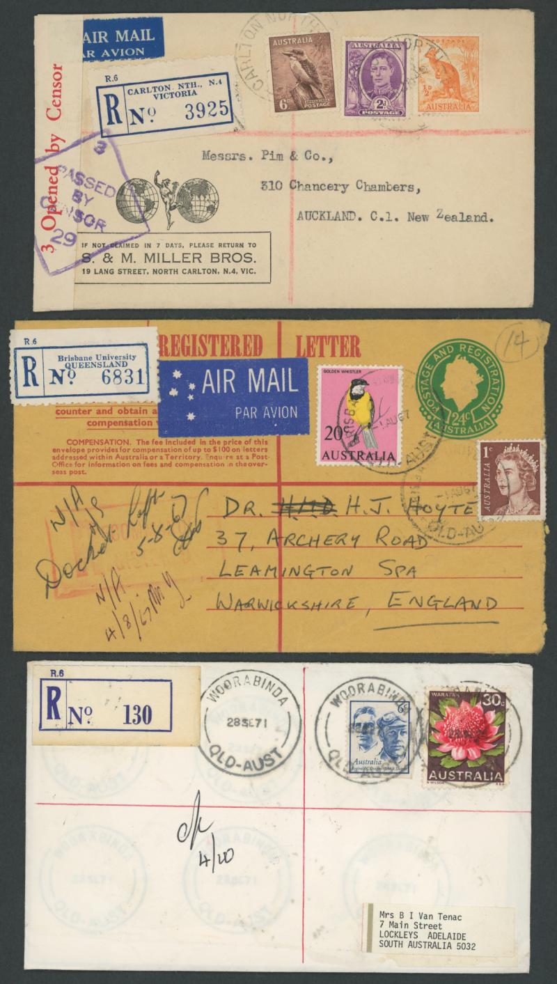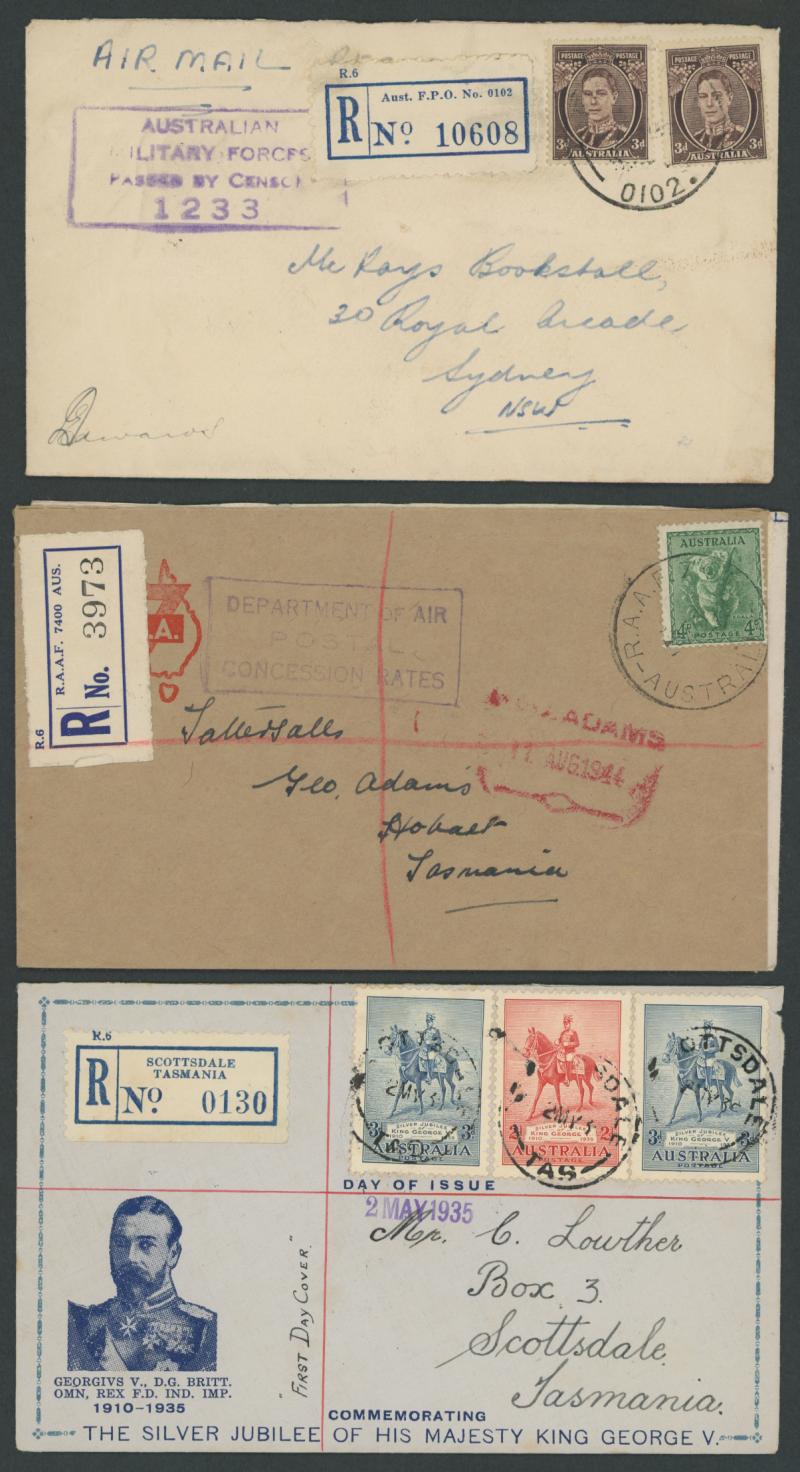 red/white R label, 1926 Registration Envelope KGV 4½d violet with Launceston oversized red/white R label, 1936 Thursday Island to England with black & blue/white R label, 1944 Military 'Aust F.P.O. No.0102' and 'R.A.A.F. 7400 AUS.' R labels with