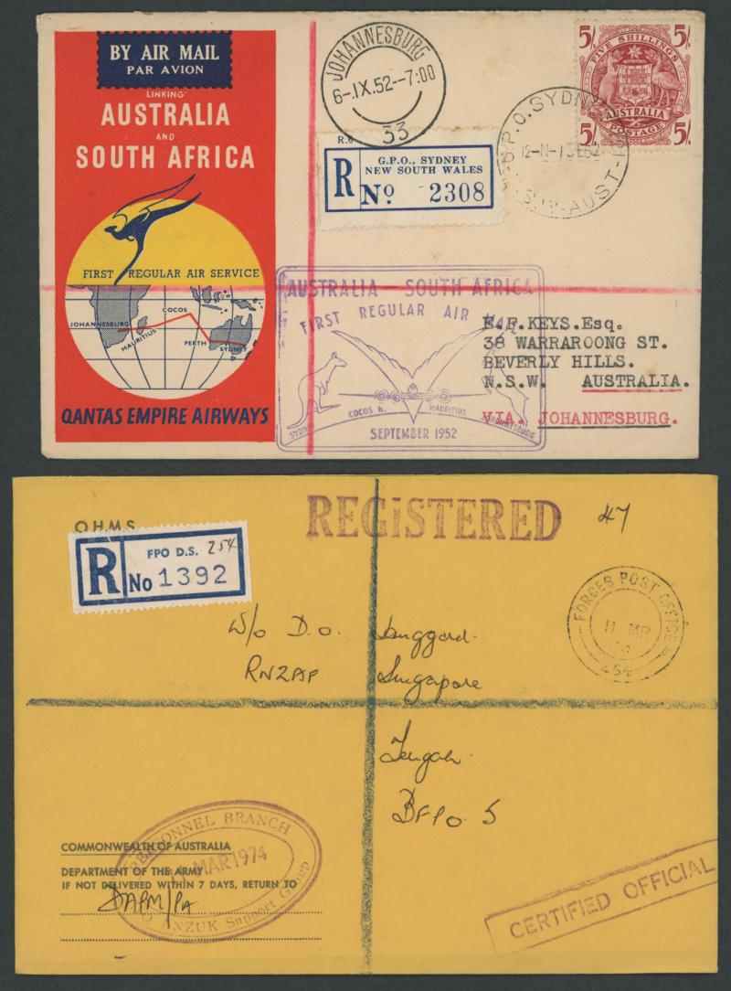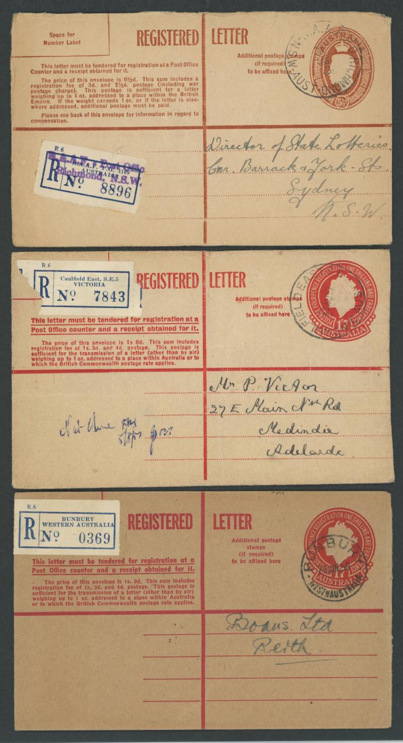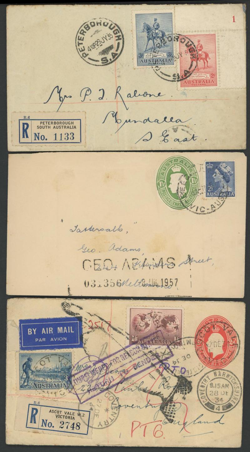 red/white R label, 1926 Registration Envelope KGV 4½d violet with Launceston oversized red/white R label, 1936 Thursday Island to England with black & blue/white R label, 1944 Military 'Aust F.P.O. No.0102' and 'R.A.A.F. 7400 AUS.' R labels with