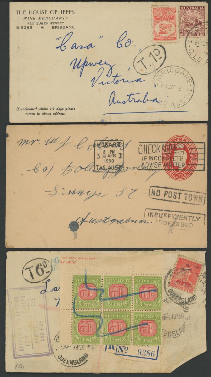 Dues, batch of flights x31 with a few better frankings, Decimal period x60+ including better stamps, unusual rates, instructional handstamps, etc, condition variable but most are fine to very fine.