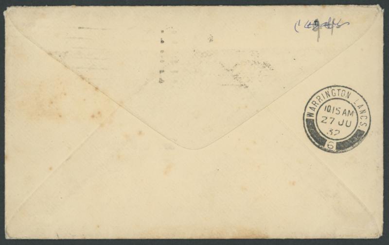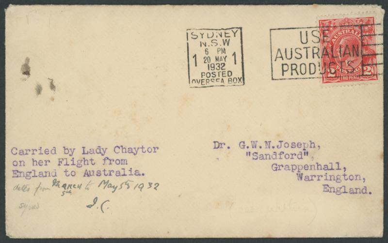 Chaytor/on her Flight from/England to Australia" and initialled "IC", addressed back to England with Australian KGV 2d red tied by Sydney slogan cancel of '20MAY/1932' and 'WARRINGTON LANCS/27JU/32/ 6 ' arrival backstamp, light even soiling,