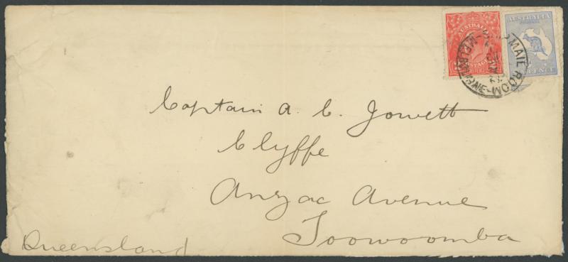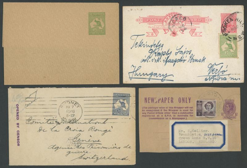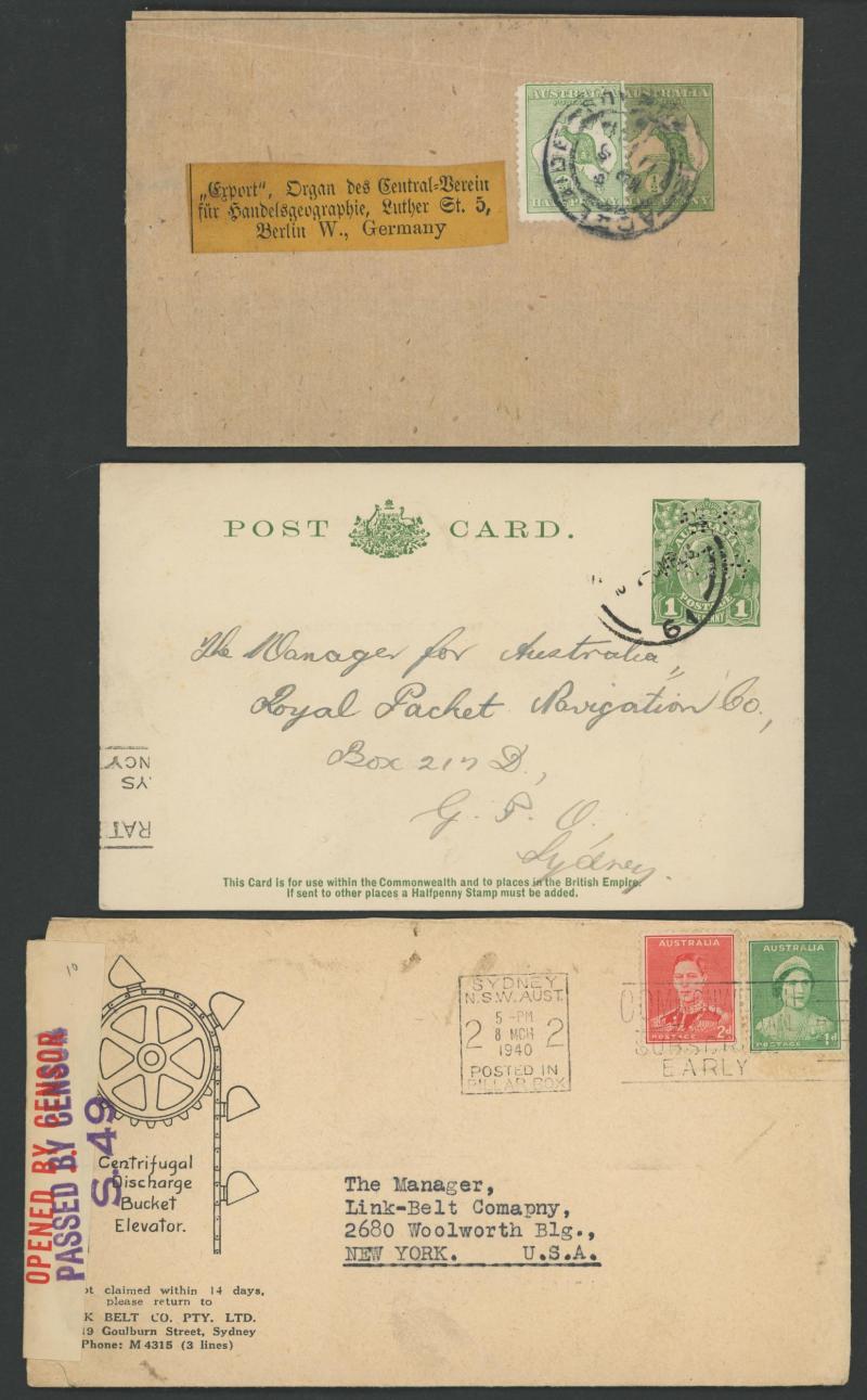 Commercial mail including 1913 Fullface 1d Postal Card to Hungary uprated with Kangaroo ½d, 1916 endorsed "Letter for Germany