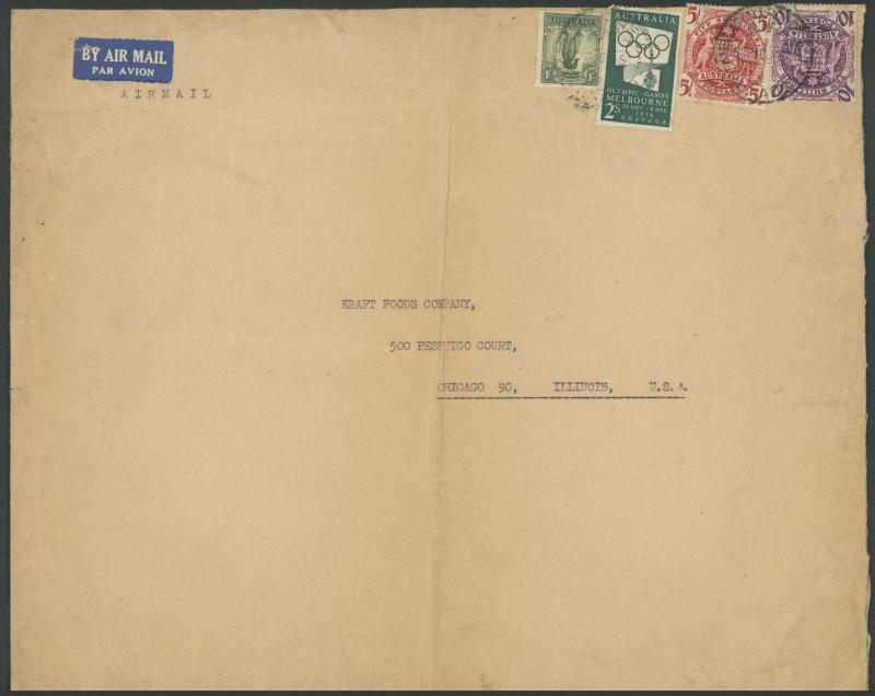 Platypus, 1/- Olympics & 1/- Colombo Plan solo frankings and to Italy with 1/- Olympics solo, plus surface-rate items noted 1939 Royal Australian College of Surgeons receipt card to Japan with QE 1d pair, 1940 to USA with 2d AIF solo, 1941 Perth