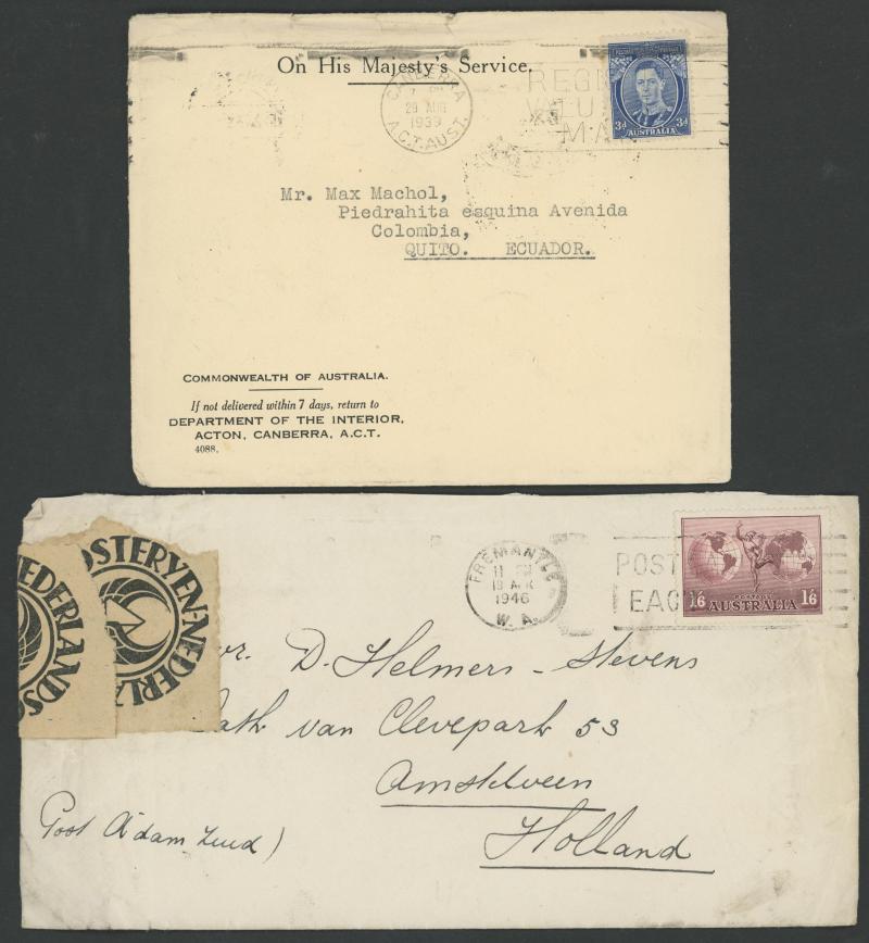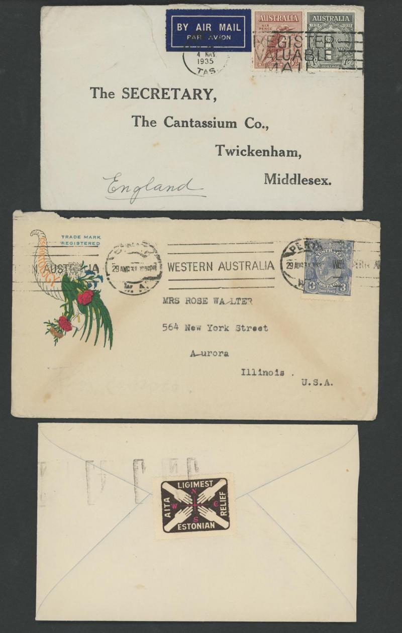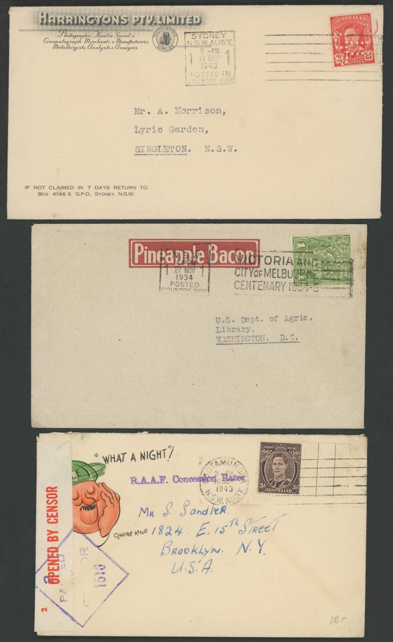 Prescott Ltd (Groceries), Wm Adams & Co (Motors), Grimley Ltd (Sadddlers, with perfins) and Centrifugal Discharge Bucket Elevator also Eschatology (Perth), others with Kangaroo or KGV frankings, 1935 to GB with Large Kookaburra 6d & ANZAC 1/-, 1928