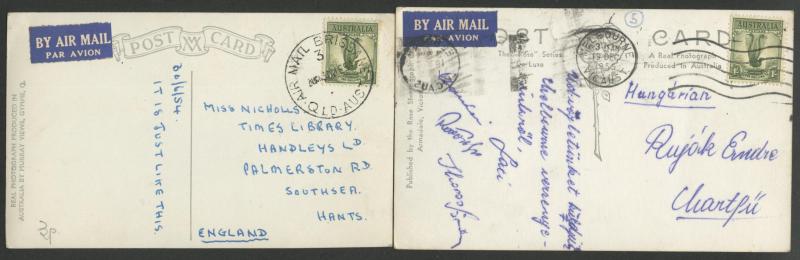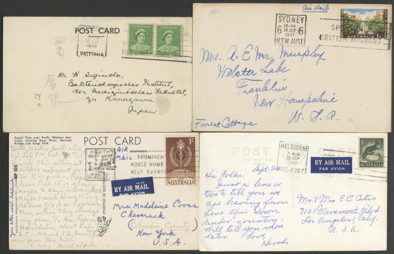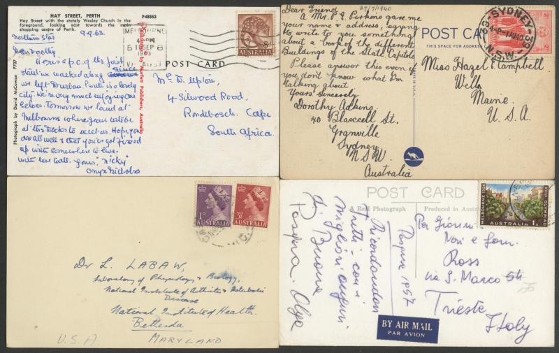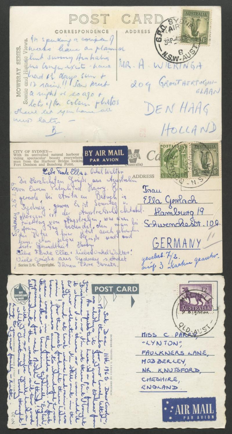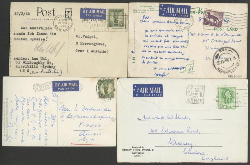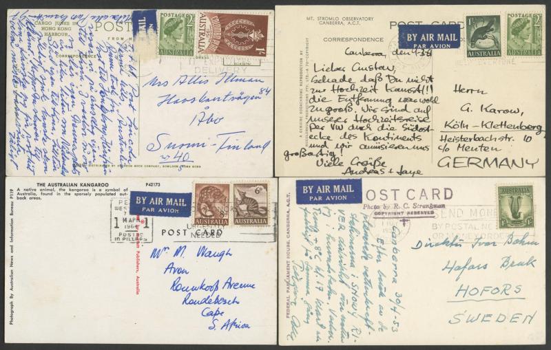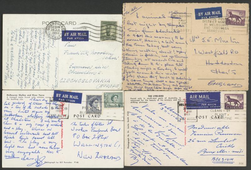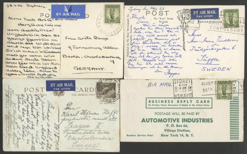 (Murrumbeena, Vic) all to England with 9d Platypus or 1/- Lyrebird solos, 1952 to Czechoslovakia with 9d Platypus solo, other 1/- Lyrebird solos to USA (business reply postcard), Austria, Czechoslovakia, Germany, Holland, Hungary & Sweden, 1961