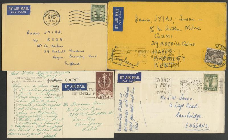 Airmail postcards to overseas destinations including QSL cards '5FH' (Glen Osmond, SA), 'VK2AMB' (Cremorne, NSW) & 'VK3YL'