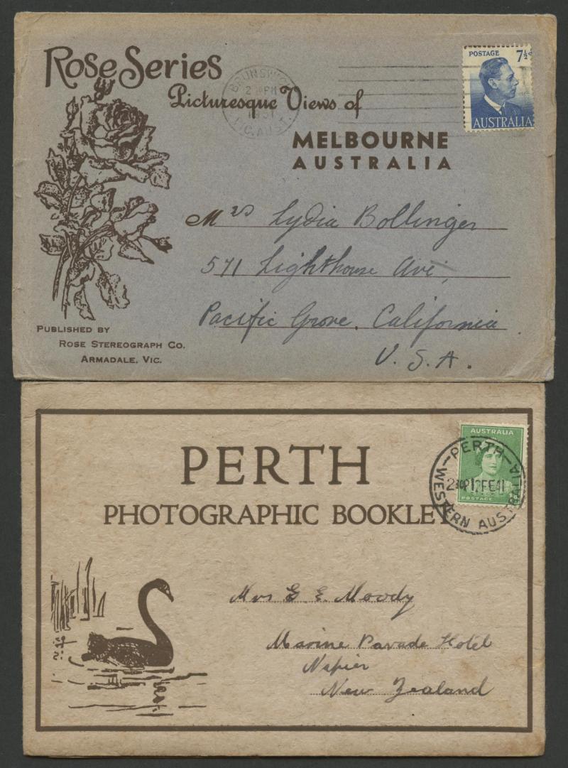 'Photographic Booklet' to New Zealand with QE 1d solo (while entitled to reduced rates), 1951 Melbourne postcard wallet to USA with KGVI 7½d solo for foreign letter rate (no longer entitled to reduced rates), 1963 to South Africa with 8d Tiger Cat