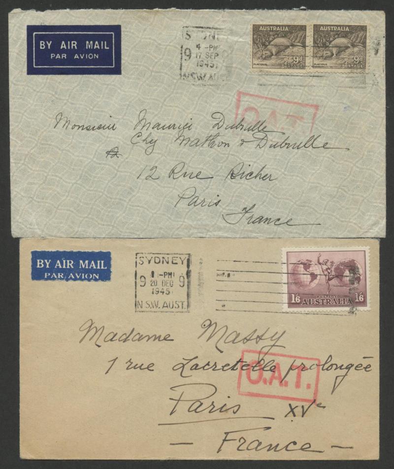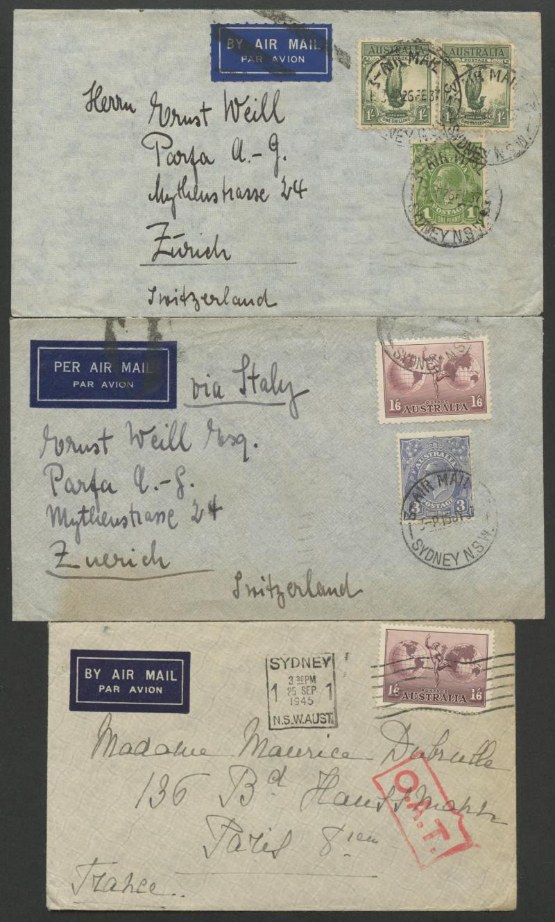 airmail' rate x2 both with Paris 2-bar marking in black plus similar at 1/9d rate endorsed "via Italy" but with Paris transit, 1938 to Germany with 1/6d Hermes & 4d Koala tied by Sydney 'LATE FEE' machine cancel endorsed "Via Italy" with 'X' marking