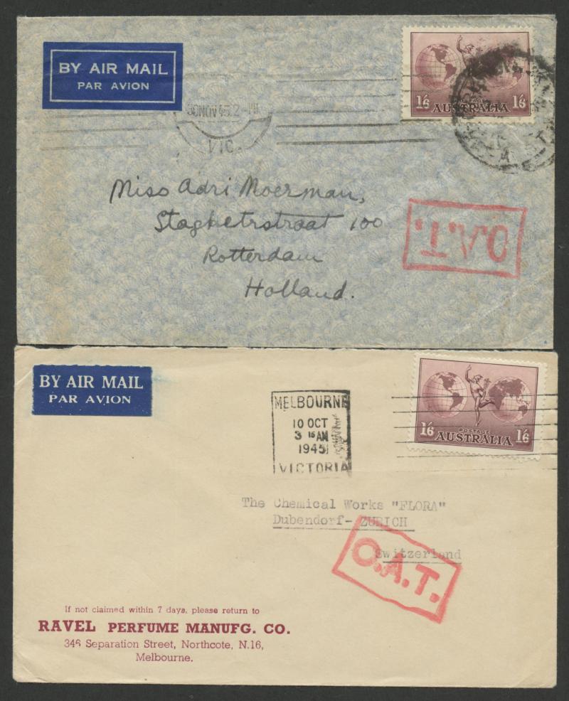 and similar with KGV 3d blue & 1/6d Hermes, 1945 (July) to Switzerland with Cairo 6-bar jusqu'a marking in red where diverted to surface transportation (civilian airmail services to Europe were yet to be reinstated), and late 1945 (Sept-Dec) to