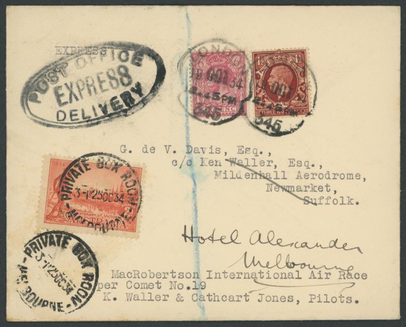1934 MacRobertson Air Race typed cover for K Waller & Cathcart Jones endorsed "per Comet No.19" with Great Britain KGV 1½d brown &
