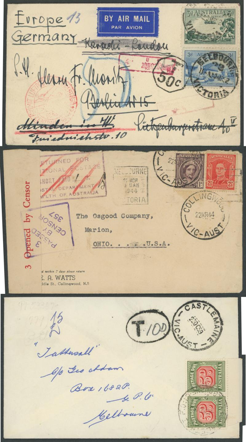 faults), 1929 to Scotland endorsed "Air Mail" with KGV 1½d red pair and GB 3d Dues plus similar 1931 cover with 3d Airmail (faults) and GB 1d & 3d Dues, 1932 to Germany endorsed "Karachi-London" airmail but taxed & endorsement crossed-out still with