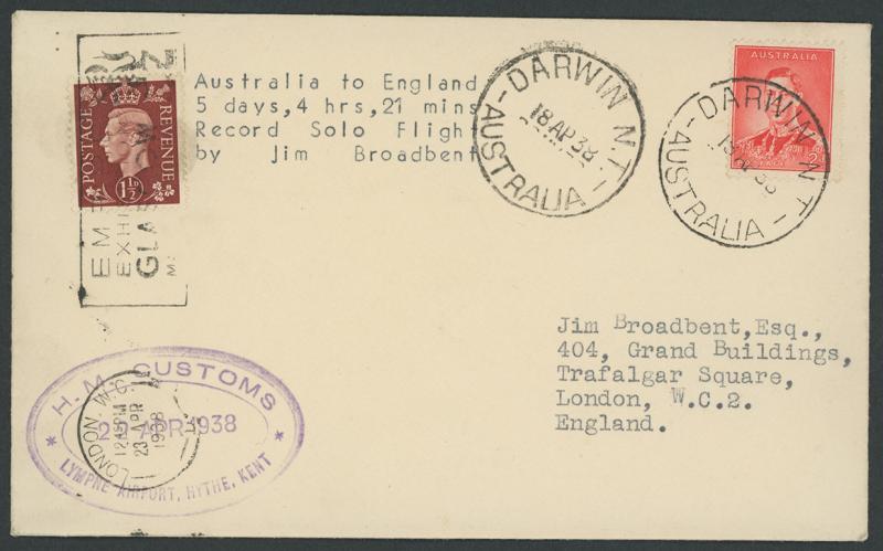 Flight", Australia KGVI 2d red tied by 'DARWIN N.T./AUSTRALIA' cds cancel, 'H.M. CUSTOMS/22APR1938/LYMPNE AIRPORT, HYTHE' KENT' triple-ring rubber oval datestamp in violet and Great Britain KGVI 1½d brown tied by London 'EMPIRE/EXHIBITION/GLASGOW'