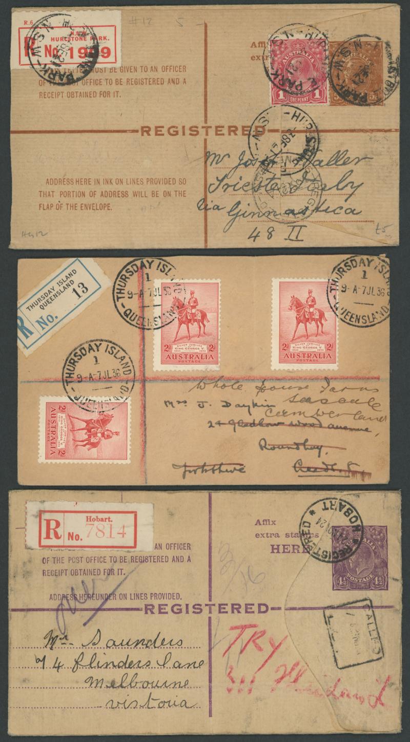 Registered Mail group including 1921 Registration Envelope KGV 5d brown to Italy with KGV 1d red added and Hurlstone Park, NSW