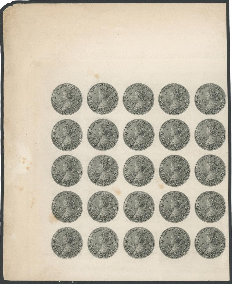 1861-88 5/- Coin plate proof in black on ungummed unwatermarked thick wove paper left half-sheet of 25 with margins large to