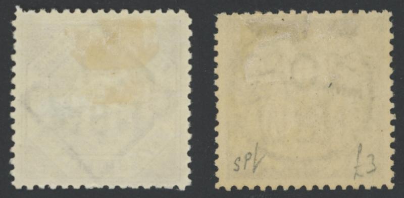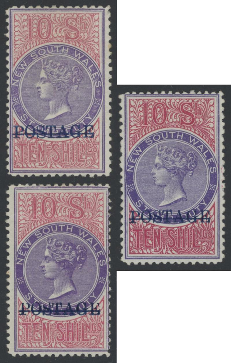 1894-1904 QV Stamp Duty Overprinted 'POSTAGE' in Blue Wmk '59' 10/- violet & claret Perf 11 SG 275a x2 (shades) and Perf 12x11 SG