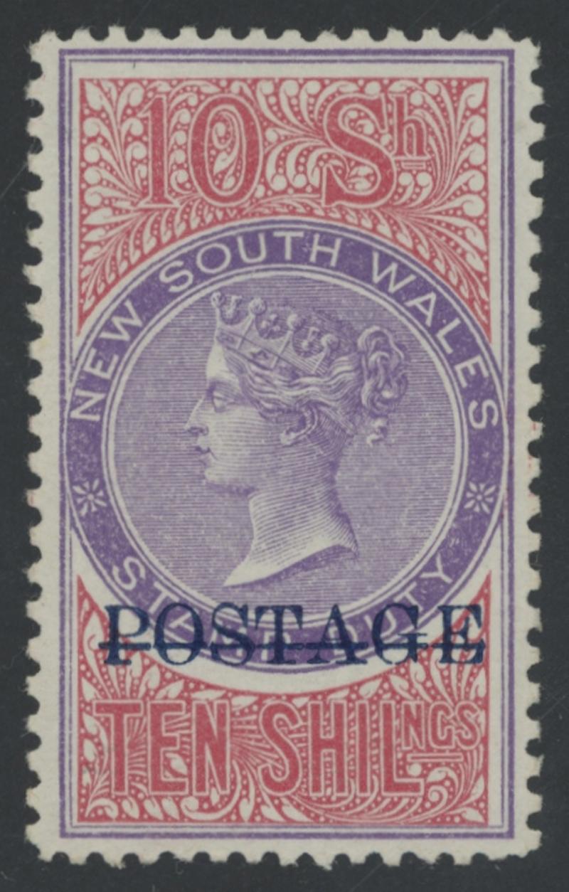 1894-1904 QV Stamp Duty Overprinted 'POSTAGE' in Blue Wmk '59' 10/- violet & claret Perf 12x11 SG 275b, exceptional centring,