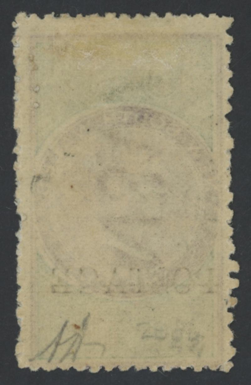 1885-86 QV Revenues Overprinted 'POSTAGE' in Black 5/- lilac & green Perf 12x10 SG 238b, excellent colours, large-part gum signed