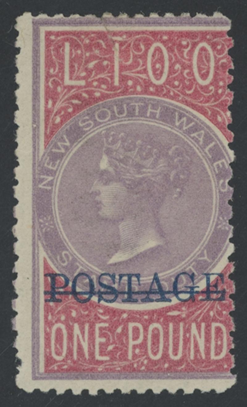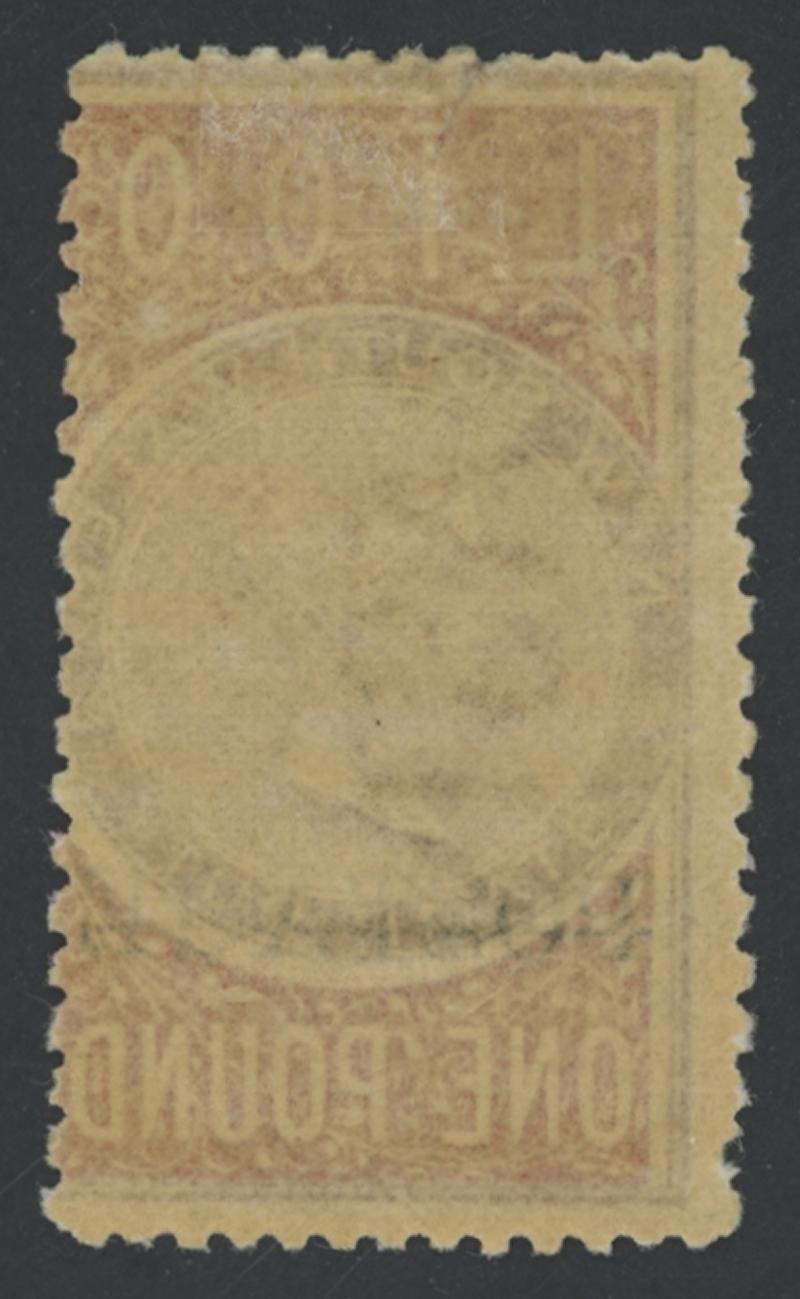 1885-86 QV Revenues Overprinted 'POSTAGE' in Blue £1 rose-lilac & claret Perf 12x10 SG 242, one pulled perf at lower-left, very