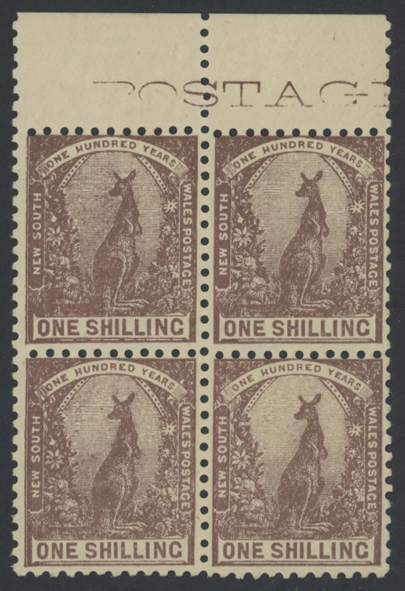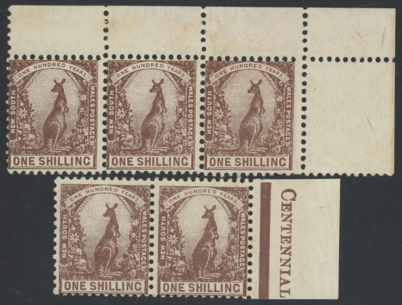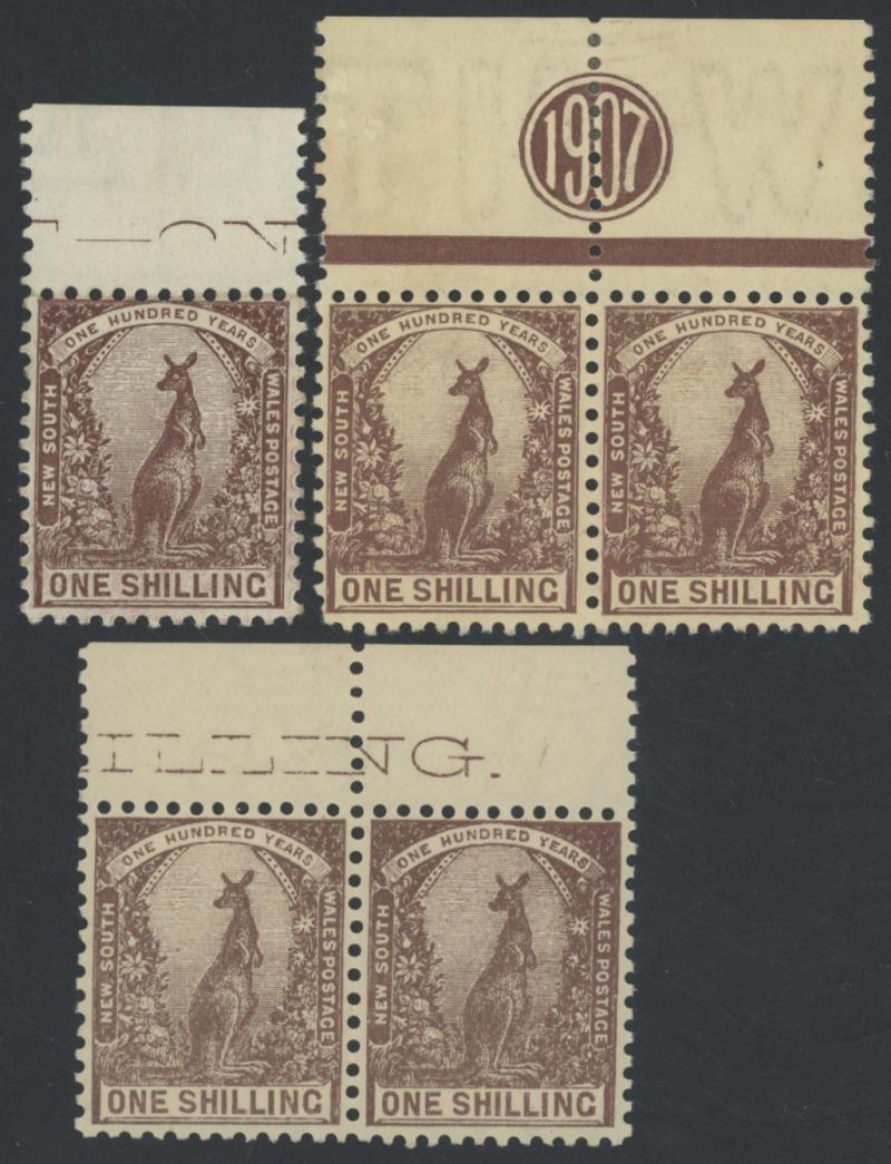 1899-1910 Shilling Kangaroo marginal selection comprising Crown/NSW Wmk single & strip of 3 (toning in the margins), Crown/Small A