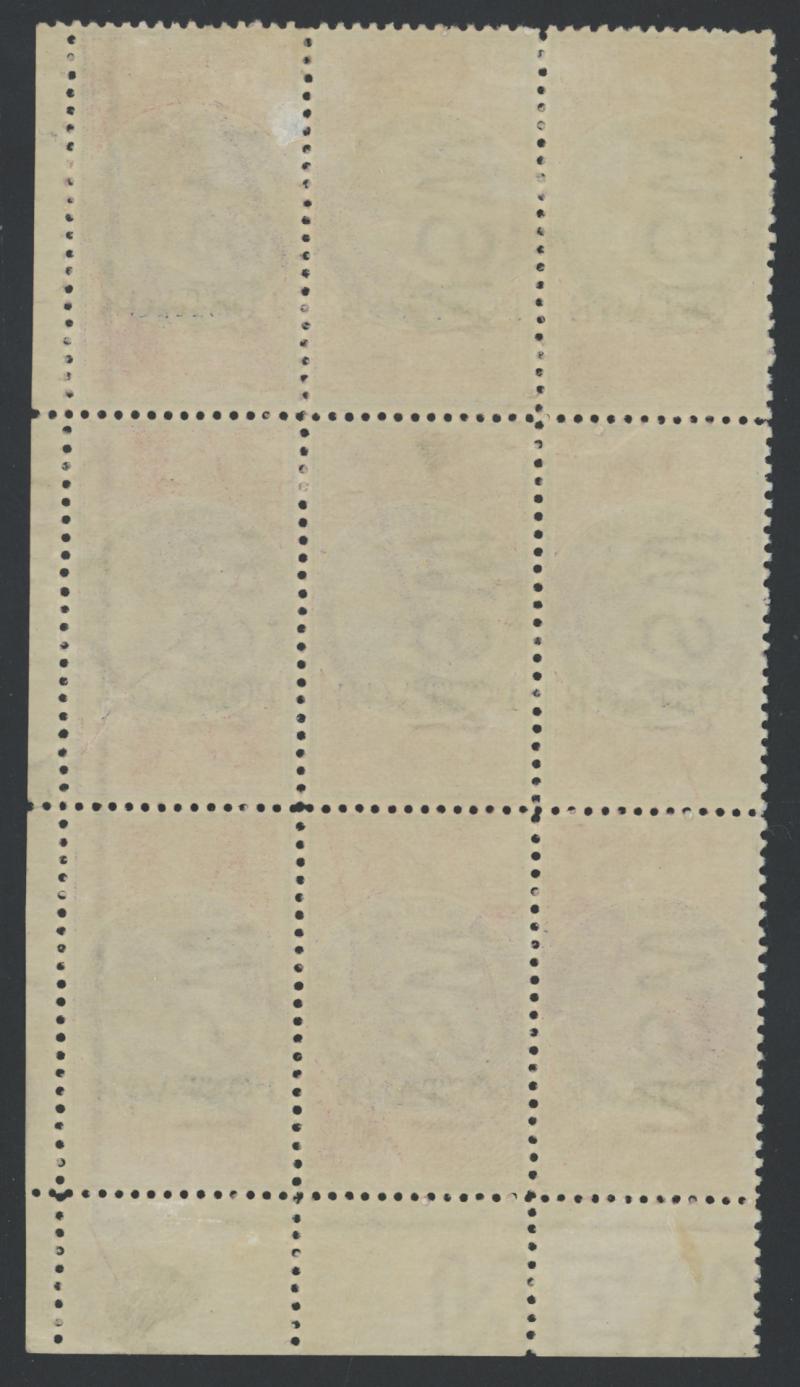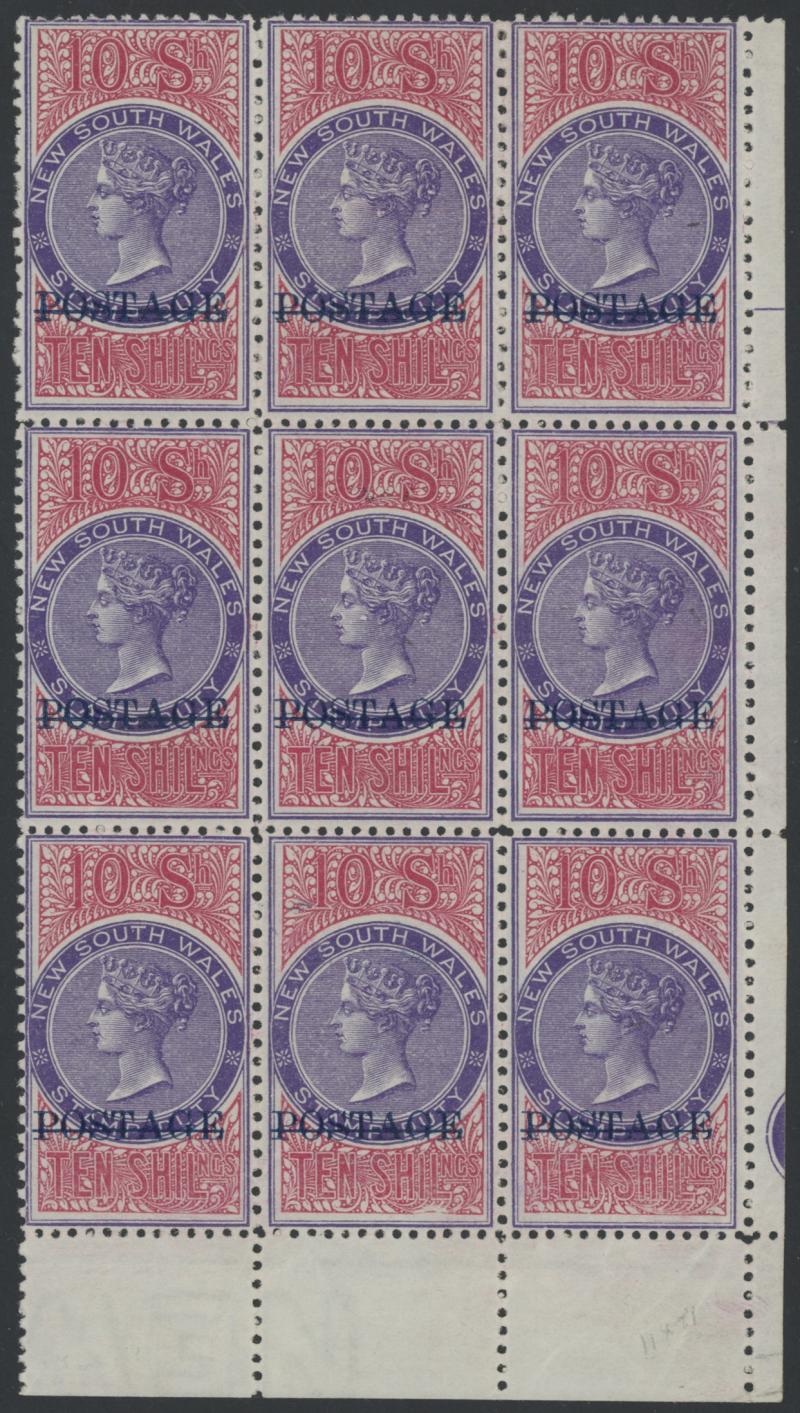 1894-1904 QV Stamp Duty Overprinted 'POSTAGE' in Blue Wmk '59' 10/- violet & claret Perf 12x11 SG 275b corner block of 9 from the