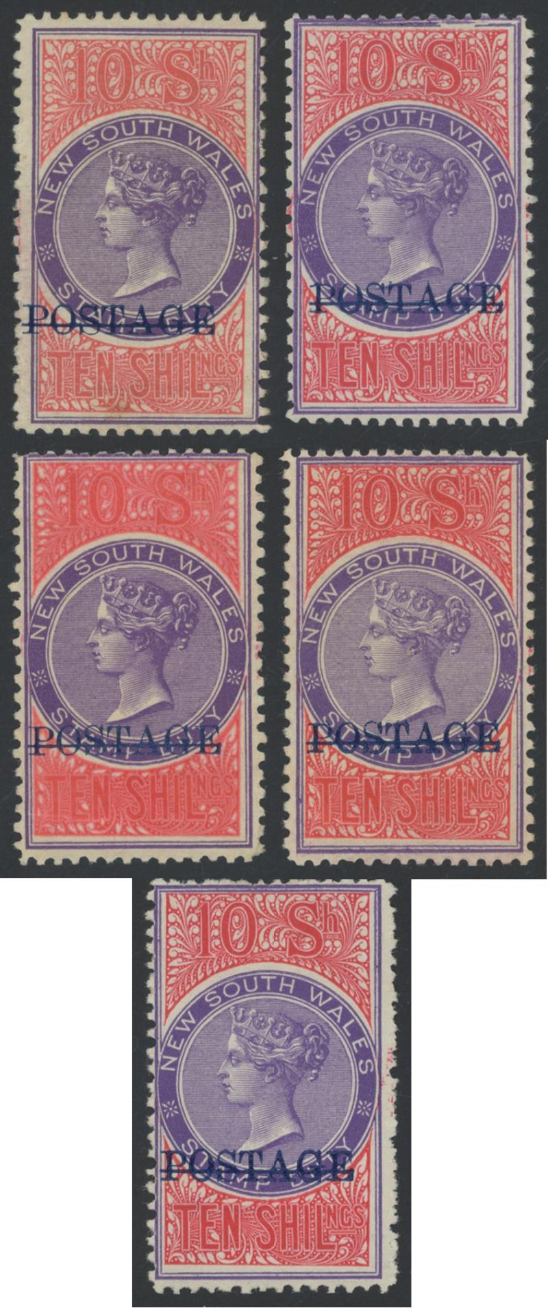 1894-1904 QV Stamp Duty Overprinted 'POSTAGE' in Blue Wmk '59' 10/- violet & claret group of five shades between SG 275 & 278