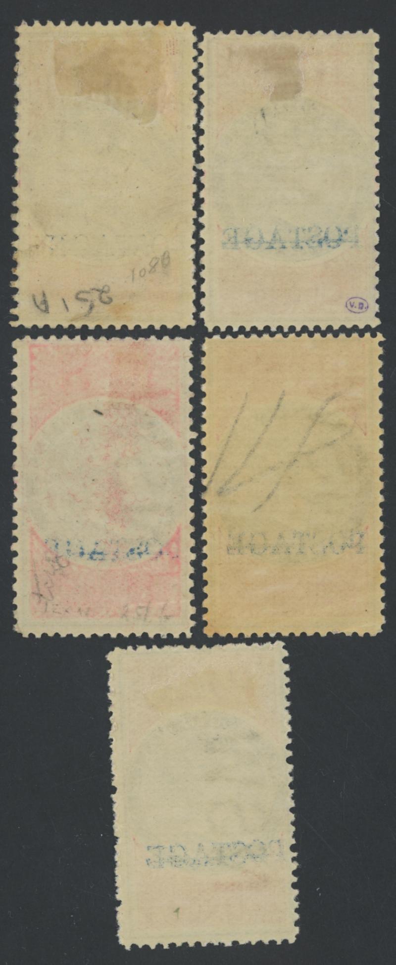 including one slightly aniline & one extremely aniline, well-centred for these issues, large-part gum, two with hinge remainders, another with large pencil notation on the reverse and two very lightly mounted, Cat £1750 minimum. (5) (Image1) (Image2)