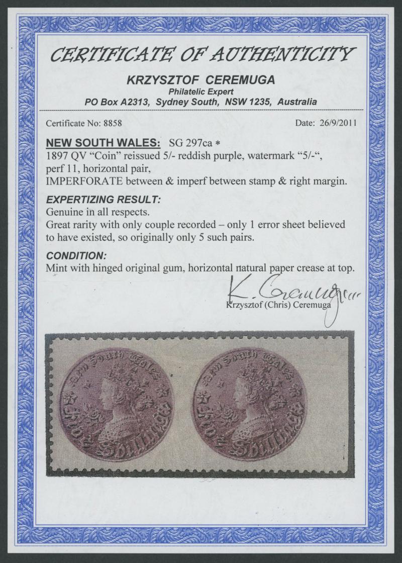 1897-99 QV Coin Re-Issue 5/- reddish purple horizontal pair from the right of the sheet Imperforate Between & at Right SG 297ca,