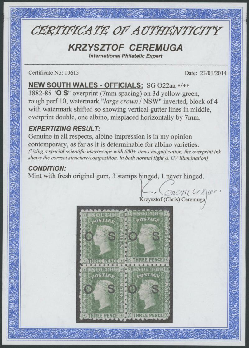 well-centred, large-part original gum, Cat £800+ for singles. Chris Ceremuga Certificate (2014). The albino overprint is grossly misplaced, appearing on each stamp as 'SO', a point not made on the expertising certificate. (Image1) (Image2)