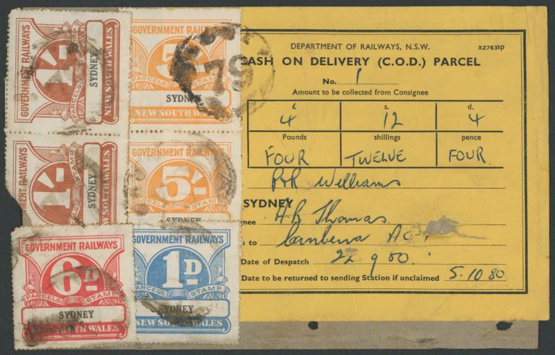 RAILWAY PARCEL STAMPS: 1960 Department of Railways NSW 'CASH ON DELIVERY (C.O.D.) PARCEL' black/yellow label on parcel wrapping