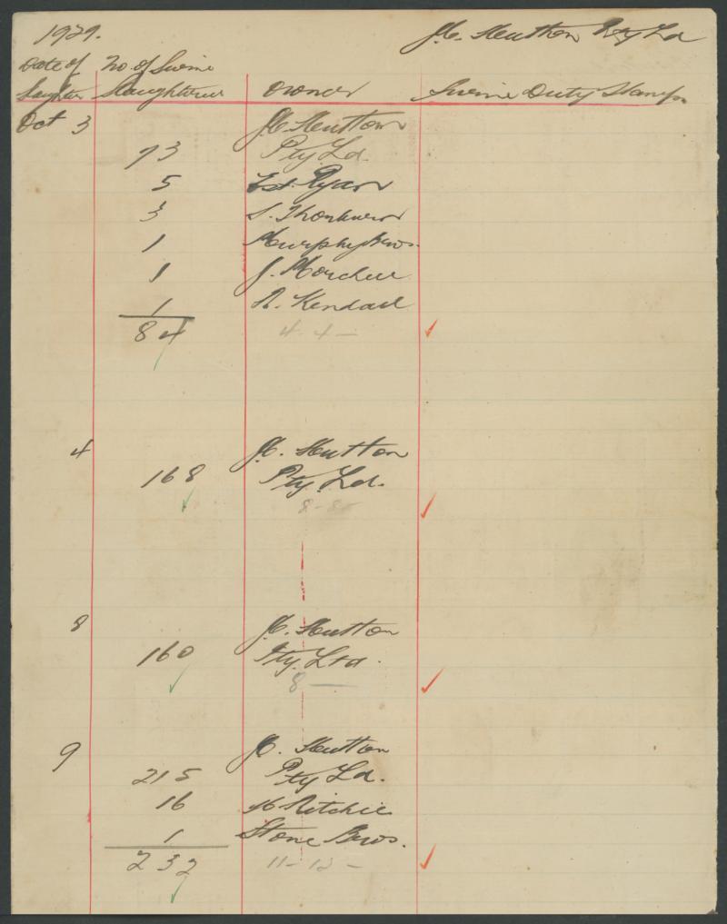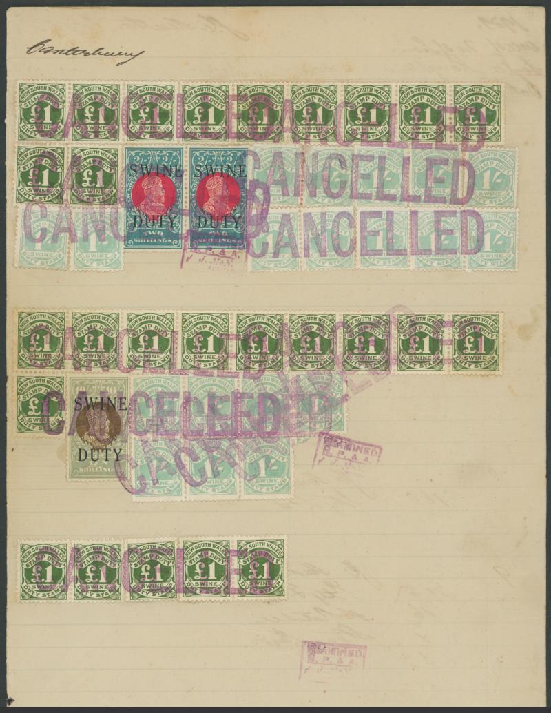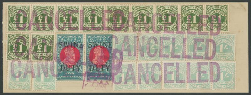 REVENUES: Ledger page franked with 'SWINE/DUTY' Overprint on KEVII 2/- pair & 10/- plus 1929 Numeral Design 1/- x19 and £1 x26,