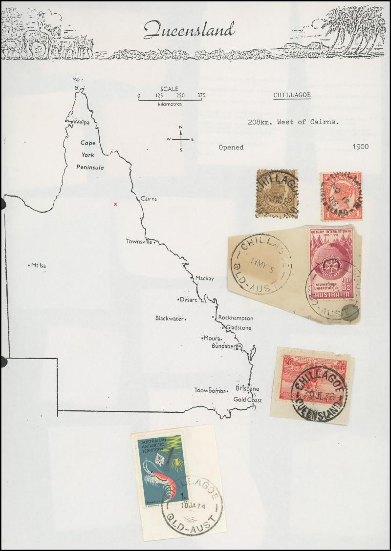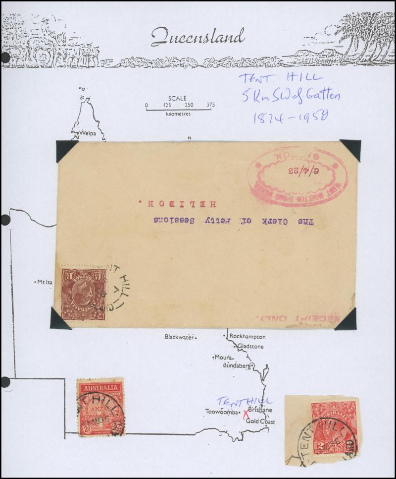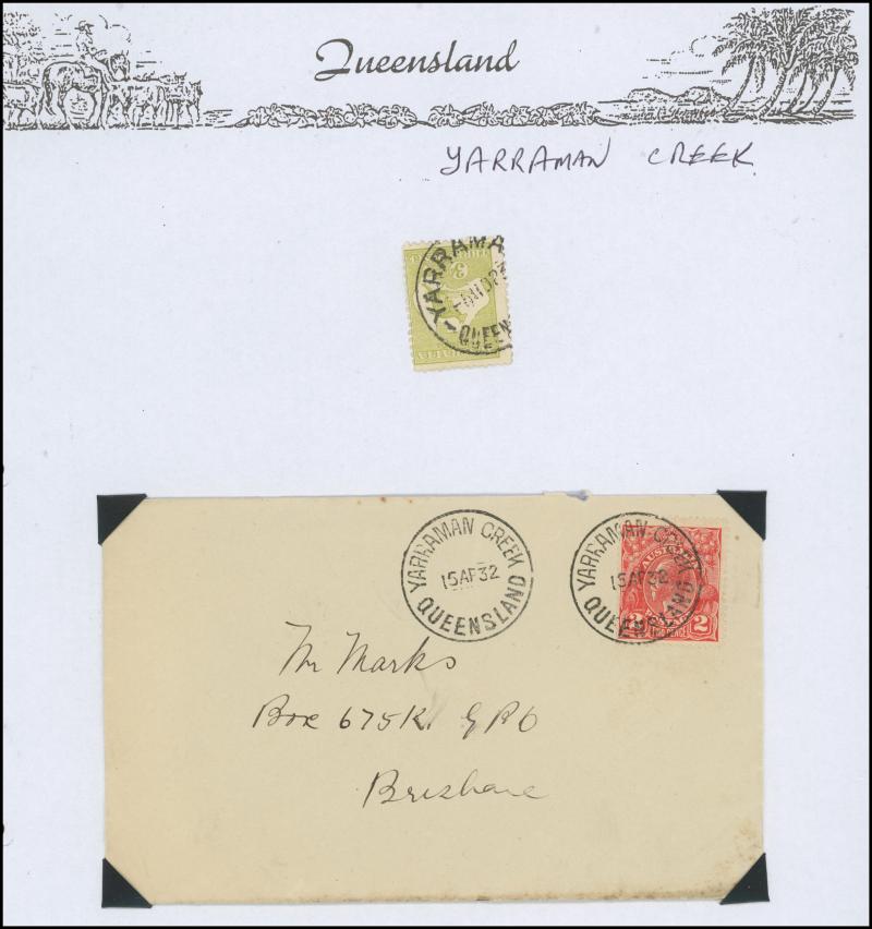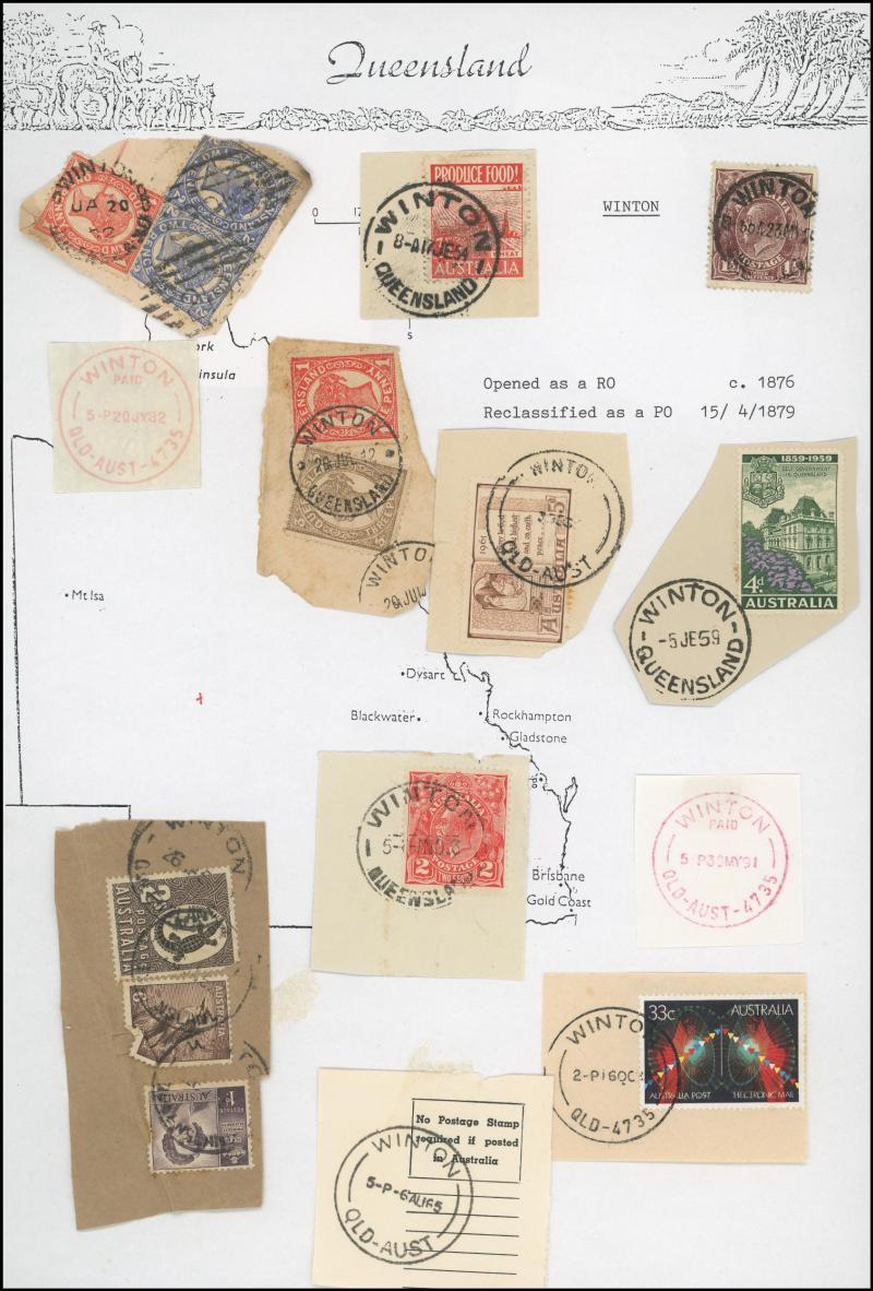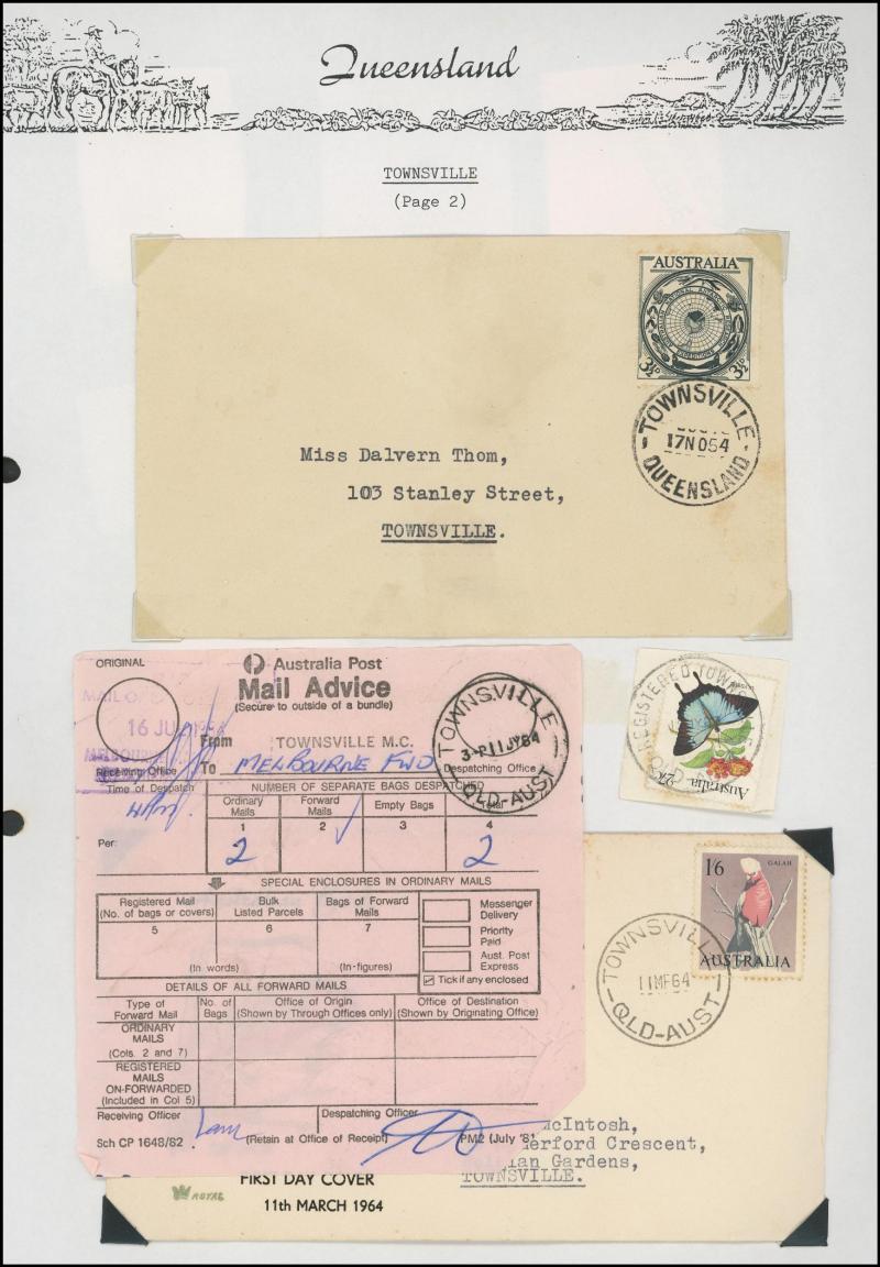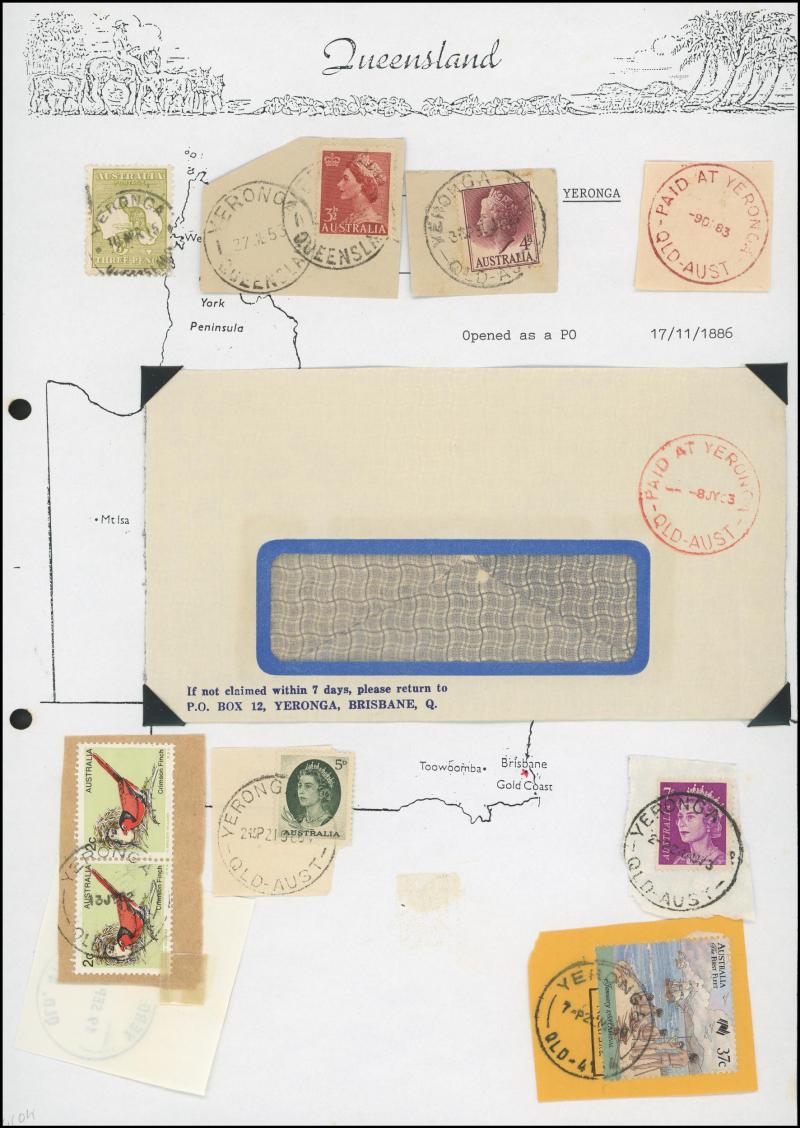 'BLUFF', 'BOOROODABIN/QLD-AUST' (LRD), 1916 'BRASSALL', 1975 'CAROLE PARK', 1965 'CINNABAR', 1898 'CRESSBROOK', 1973 'DEPOT HILL', 'EAGLE FARM AIRPORT/11AU53/...' (LRD), 1936 'EAGLEBY', 1956 'EVELYN CENTRAL', 1940 'FISHERY FALLS', 1919 'GILBERT