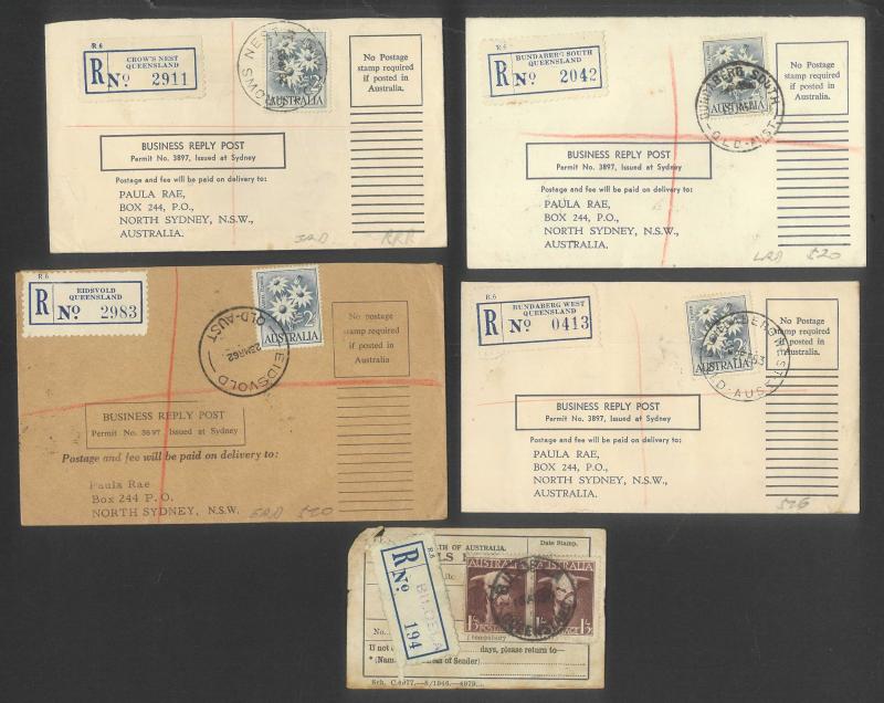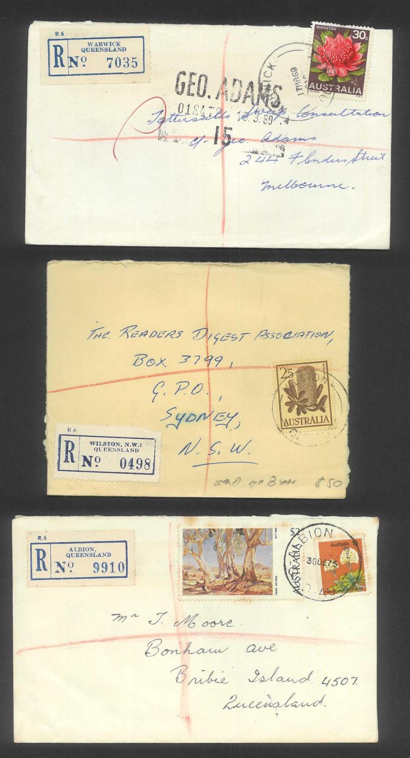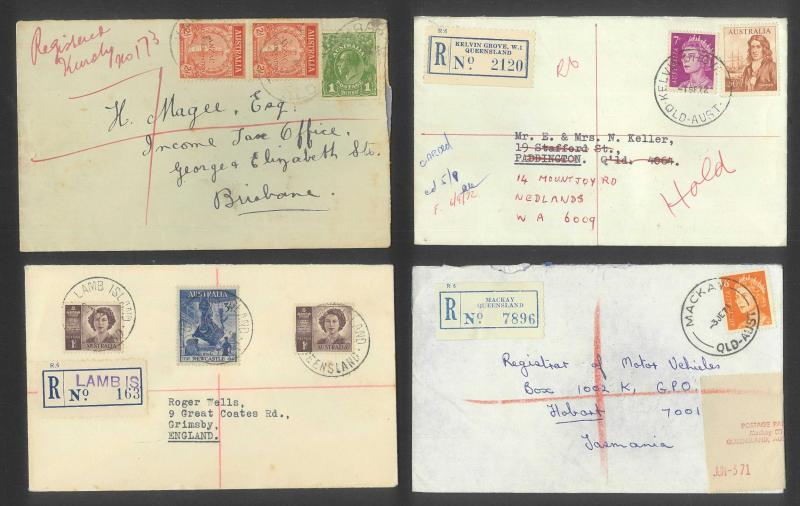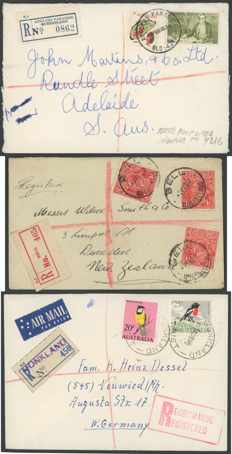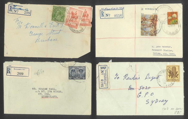 scarcer items including 'ANGLERS PARADISE/QLD-4216' (recut postcode), 1929 'BELL' with red/white R label, 'BRAMBLE HEIGHTS ___' LDL with 'NE' removed, 'DEAGON NE7', 1934 'GULUGUBA' with red/white label, 1935 'KURABY' with manuscript