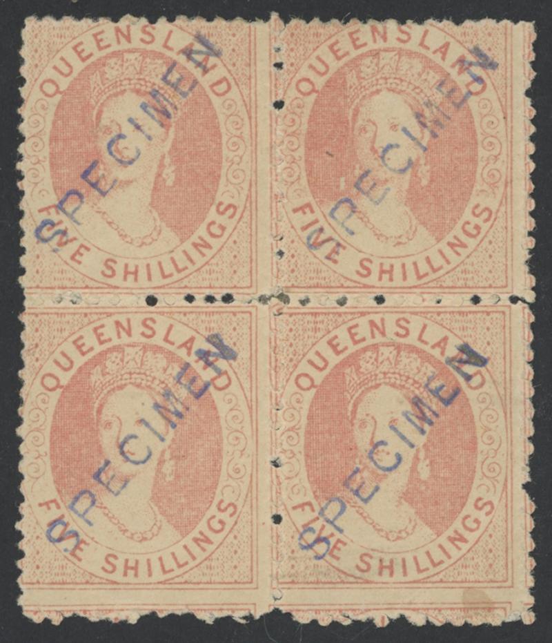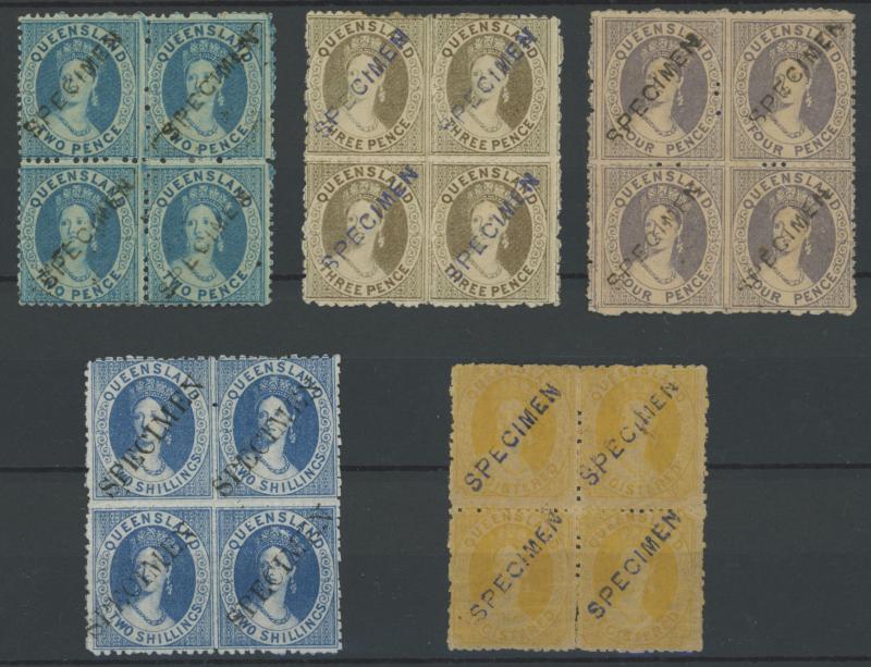 'SPECIMEN' OVERPRINTS: Small Chalons 2d blue, 3d brown, 4d lilac, 2/- blue (seriffed overprint) & 5/- pink plus 'REGISTERED'