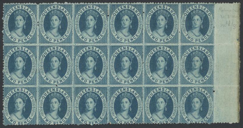 1868-74 QV Small Chalons with Truncated Star Watermark 2d blue as SG 61 but the Perf 11 reprint from 1895 marginal block of 18