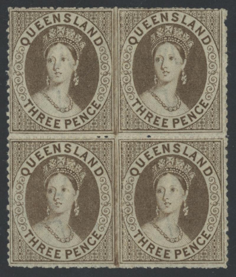 1860-61 QV Small Star Rough Perf 14-16 3d brown SG 16 block of 4, well-centred, large-part gum with the lower units being
