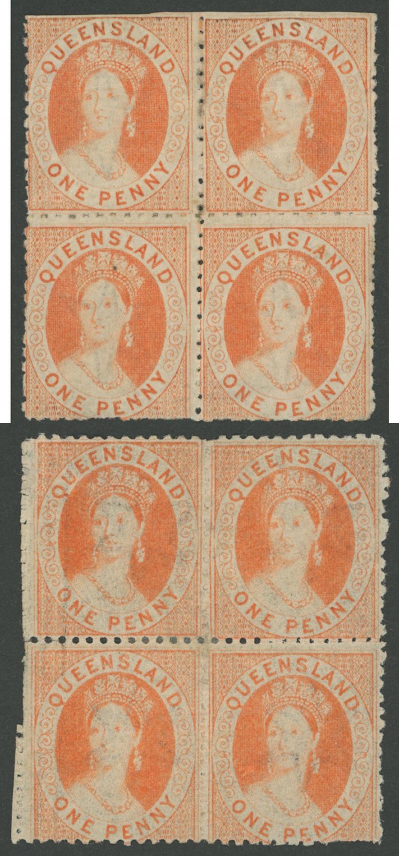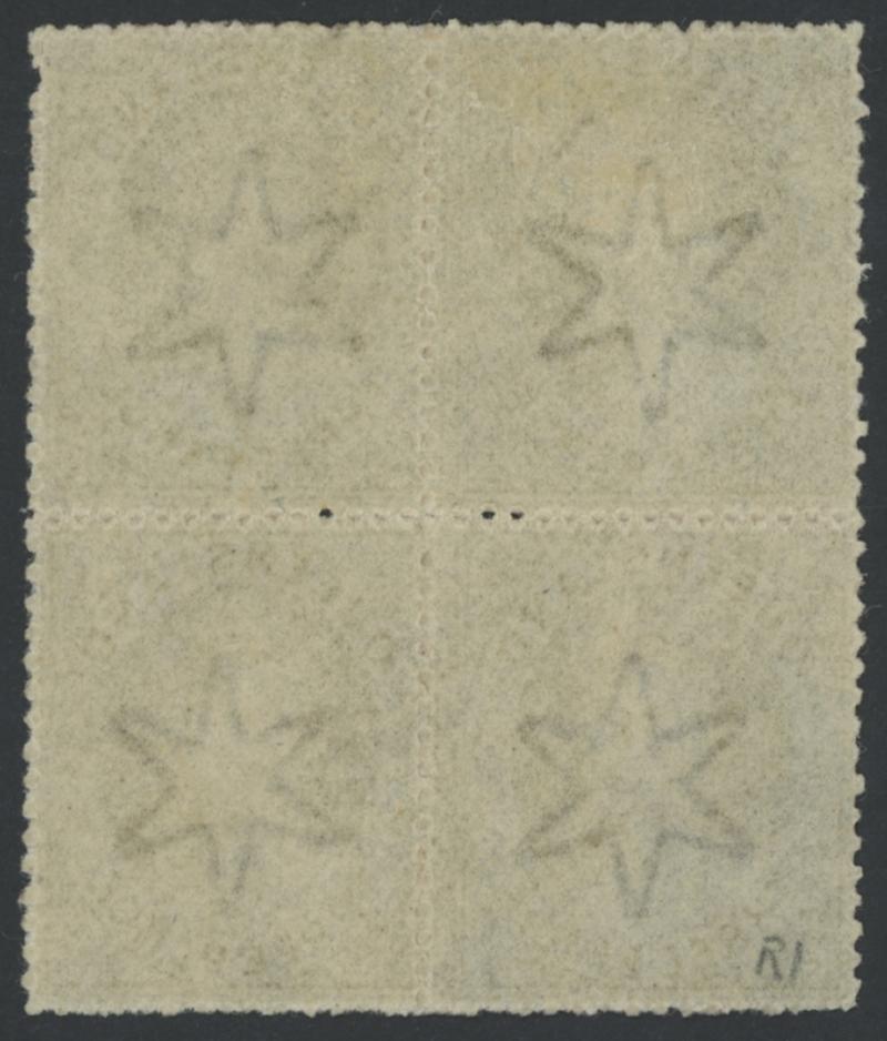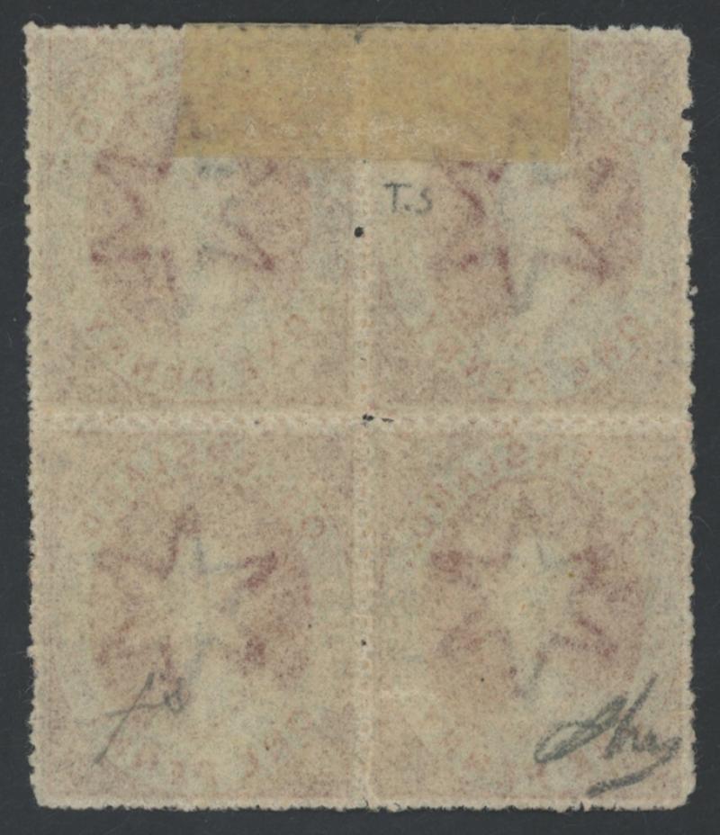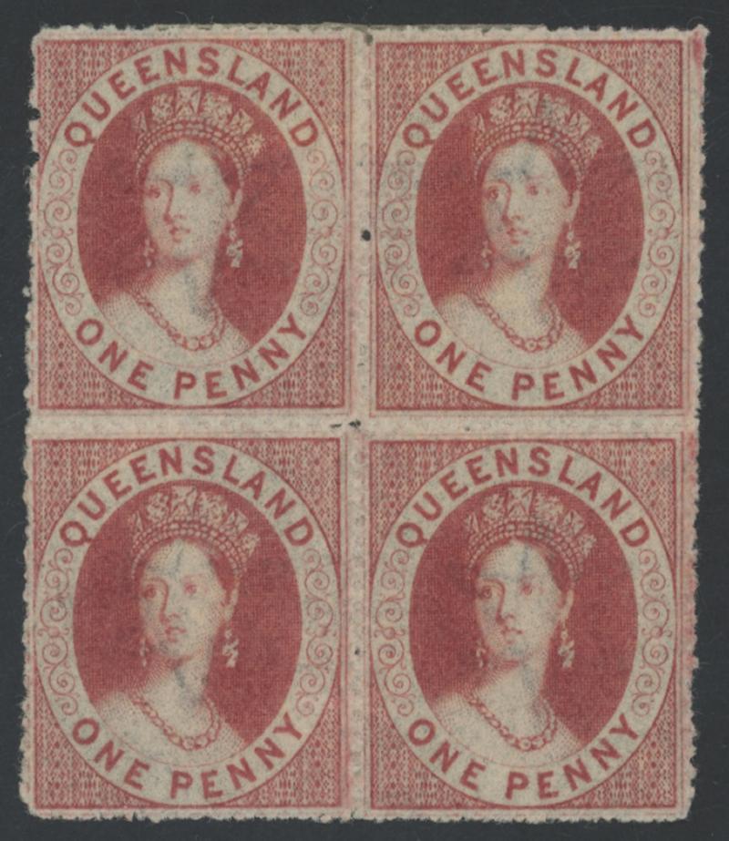 1860-61 QV Small Star Rough Perf 14-16 1d carmine-rose SG 14 block of 4, well-centred, large-part gum and the lower units are