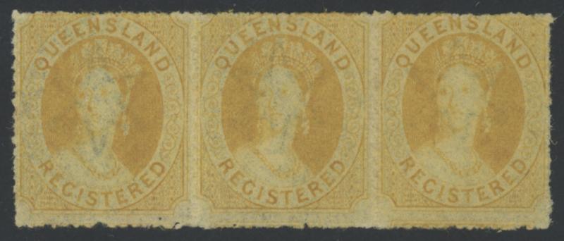1860-61 QV Small Star Rough Perf 14-16 'REGISTERED' (6d) orange-yellow SG 20 horizontal strip of 3, large-part gum with one unit