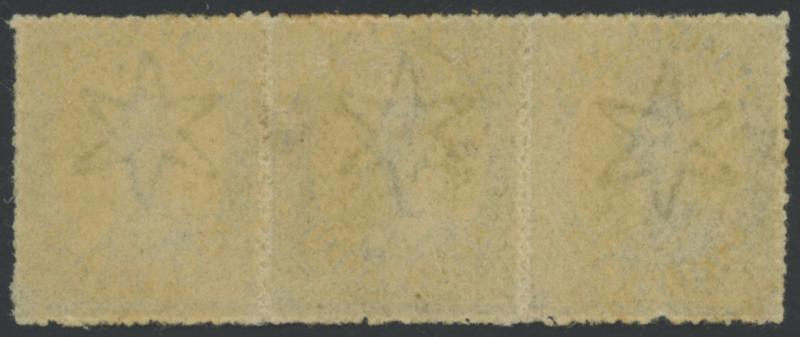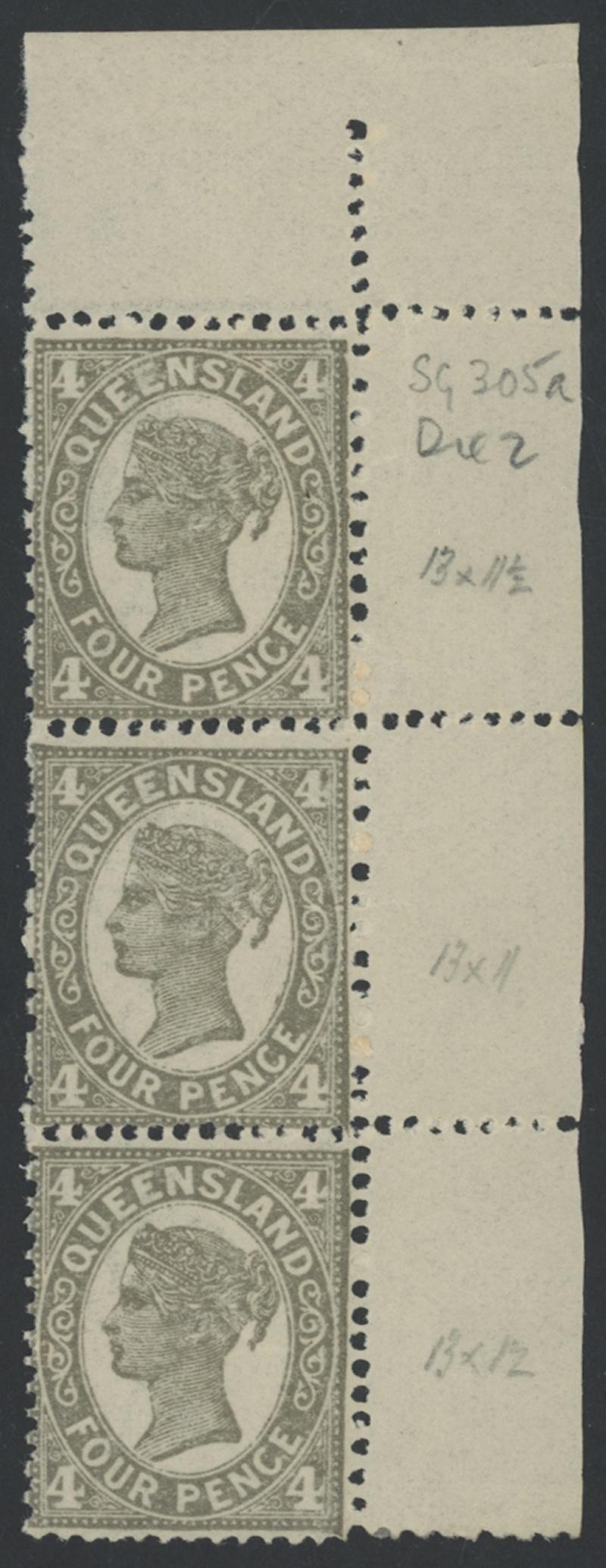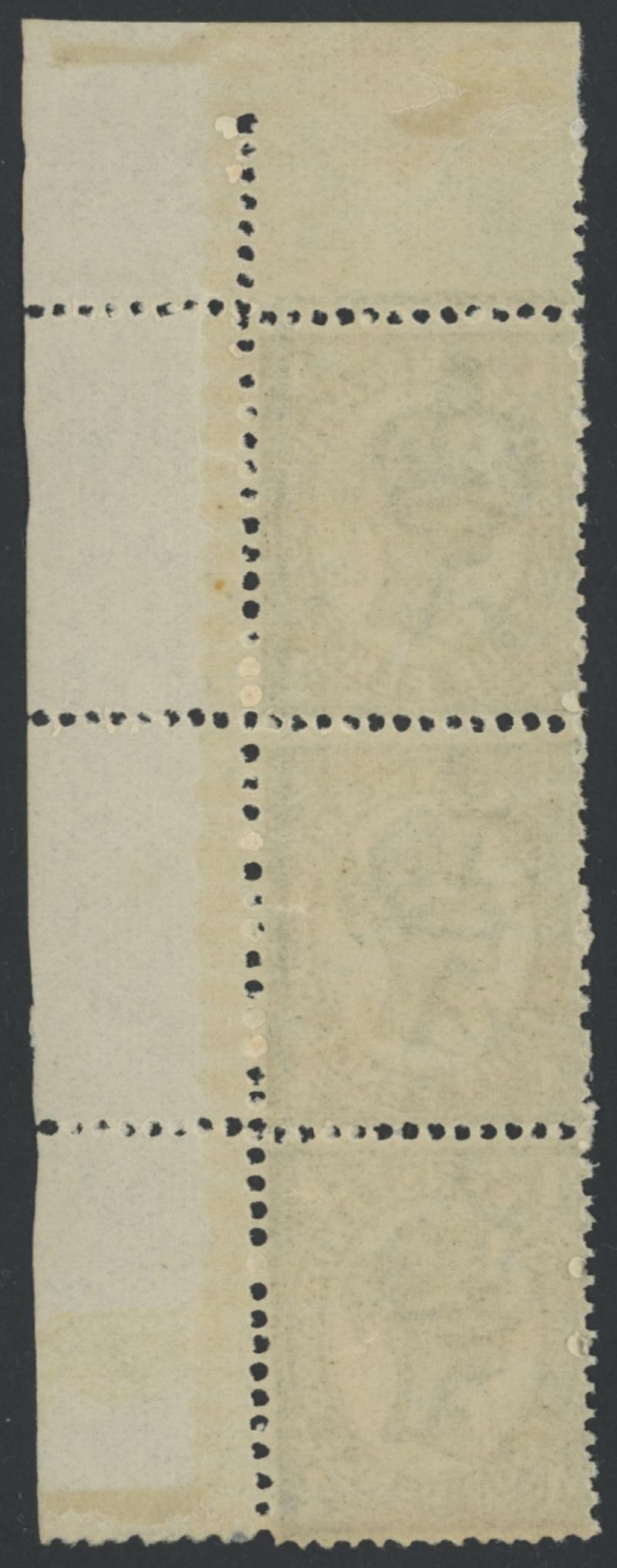 1907-11 Small Crown/A Watermark Three Perfs 4d grey Die II SG 305a se-tenant vertical strip of 3 from the upper-right of the sheet,
