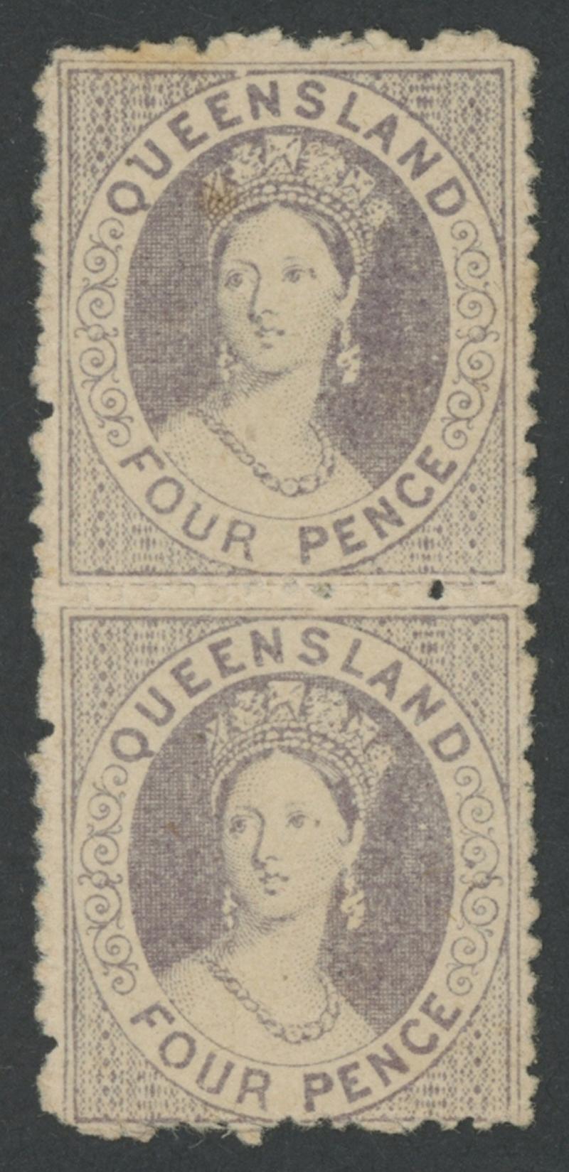 1866-67 QV Chalons Lithographed No Watermark 4d grey-lilac First Transfer (Tall Letters of Value) SG 54 vertical pair,