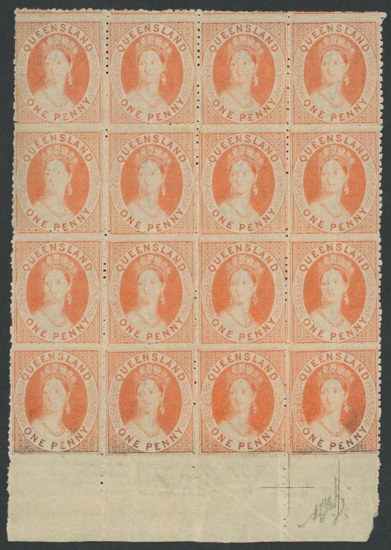 1864-65 QV Chalons Small Star Watermark Perf 12½x13 1d orange-vermilion SG 50 marginal block of 16 (4x4) from the base of the
