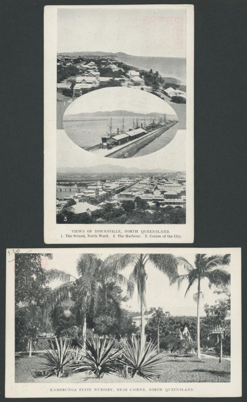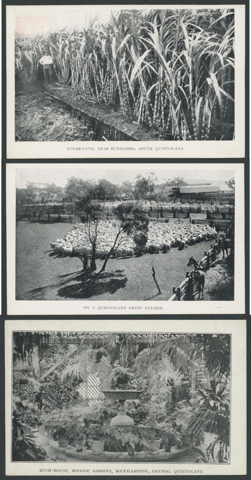 Central Queensland', 'Sugar Cane, Near Bundaberg, South Queensland', 'Kamerunga State Nursery, Near Cairns, North Queensland' (light pencil annotation), 'On A Queensland Sheep Station', and 'Views Of Townsville' triptych including wharf & shipping,