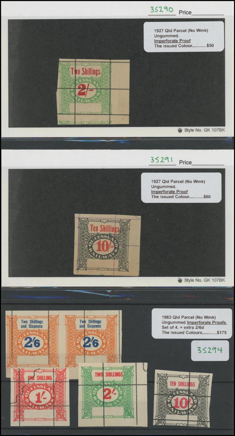 Handstamp on 1d pair x2, 3d pair & and 1/- pair reading upwards on one (some also CTO), imperforate proofs 1927 No Wmk Laid Paper 1d in blue and Wove Paper, 6d in green, 1927 No Wmk with Black Grid 2/- yellow-green and 10/- black, and 1962 1/2d in