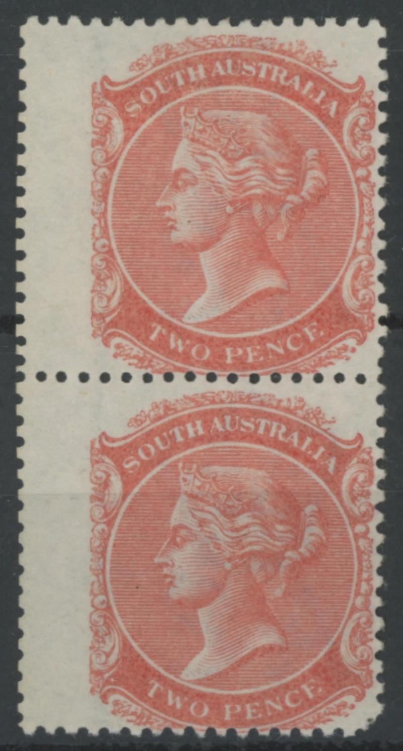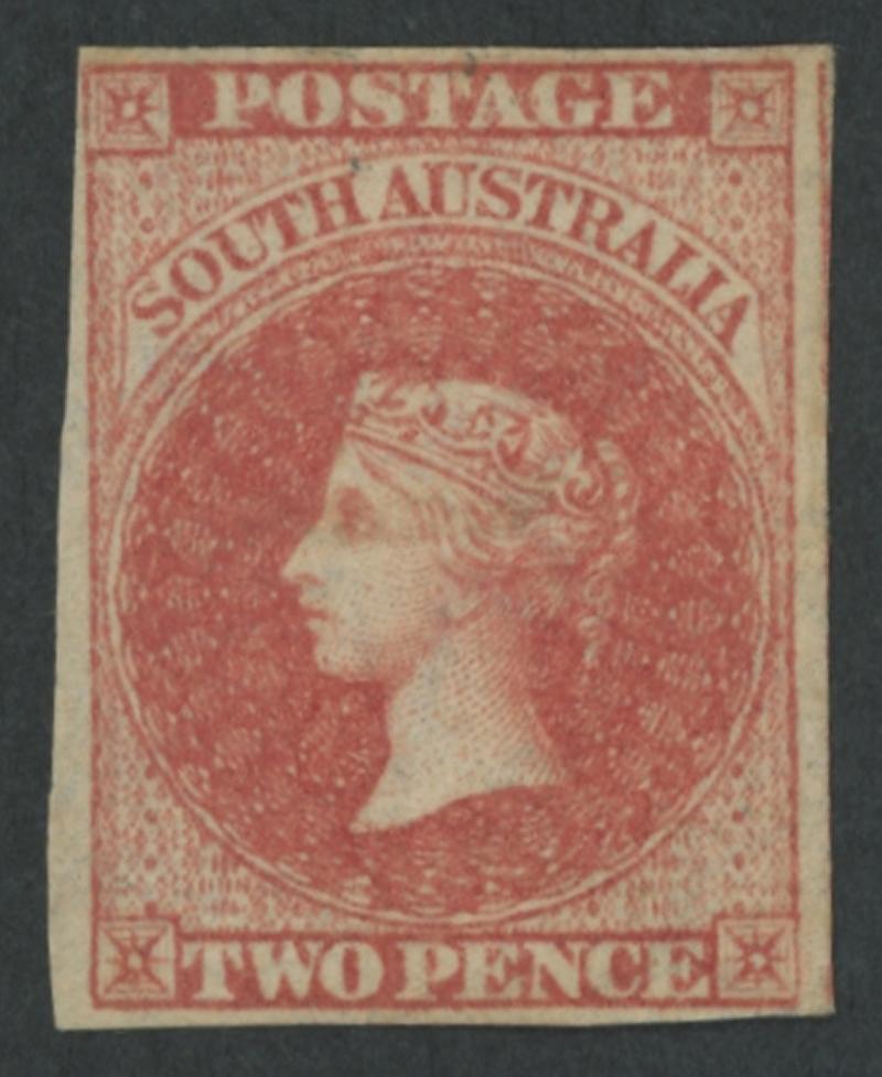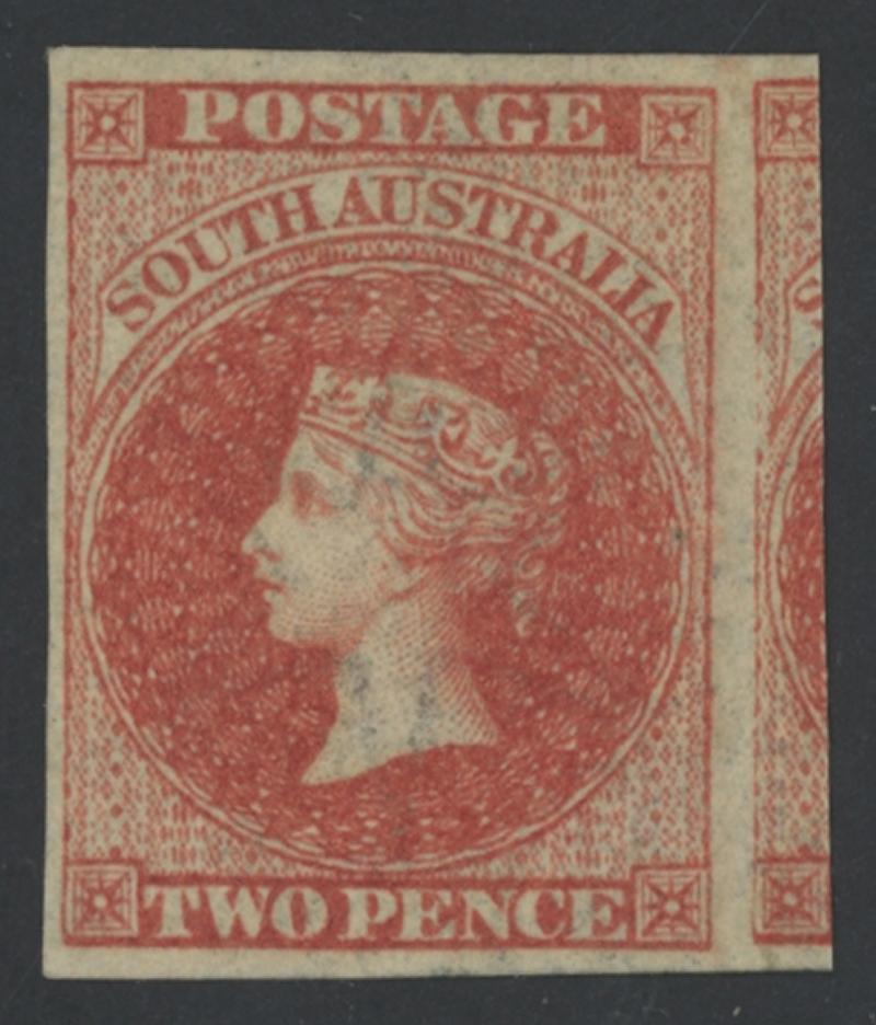 1856-58 QV Perkins Bacon Adelaide Printings Imperforate 2d red SG 9, margins just clear - at upper-left - to large with a fragment