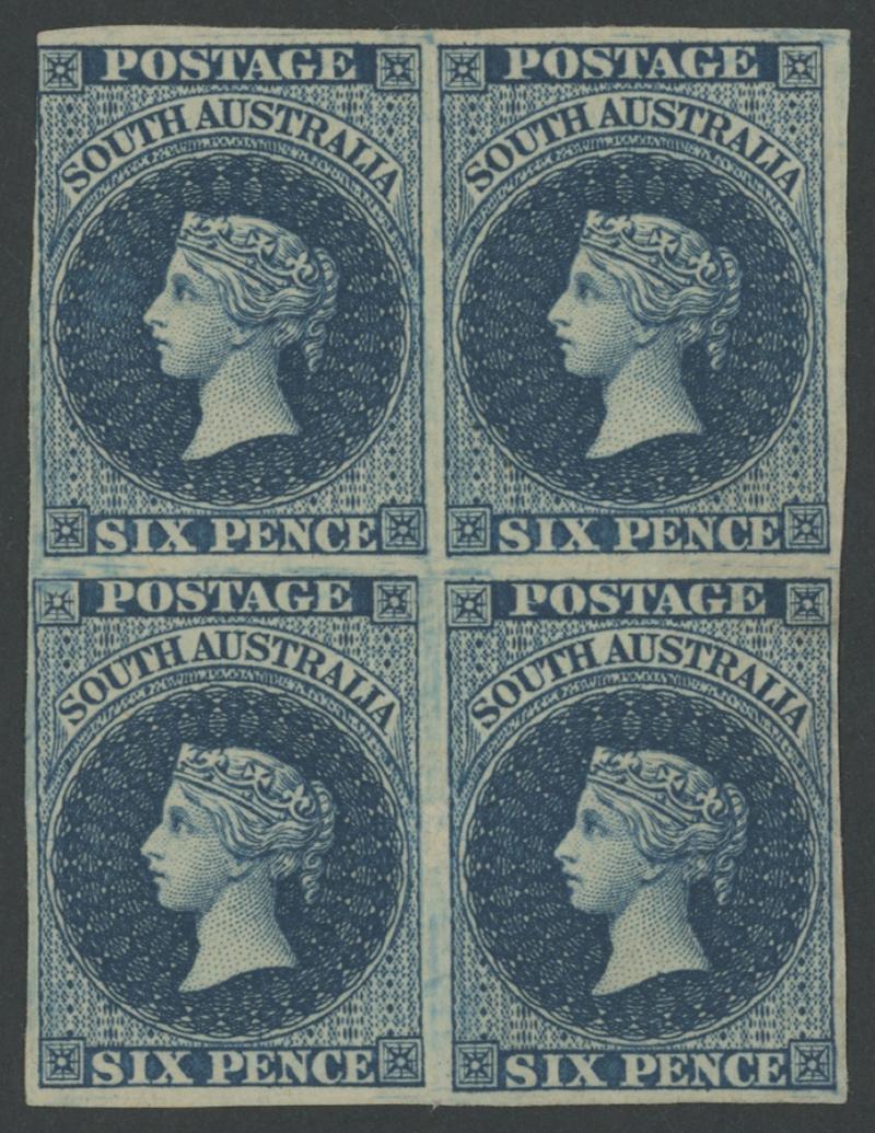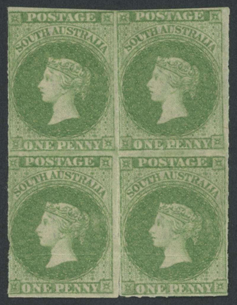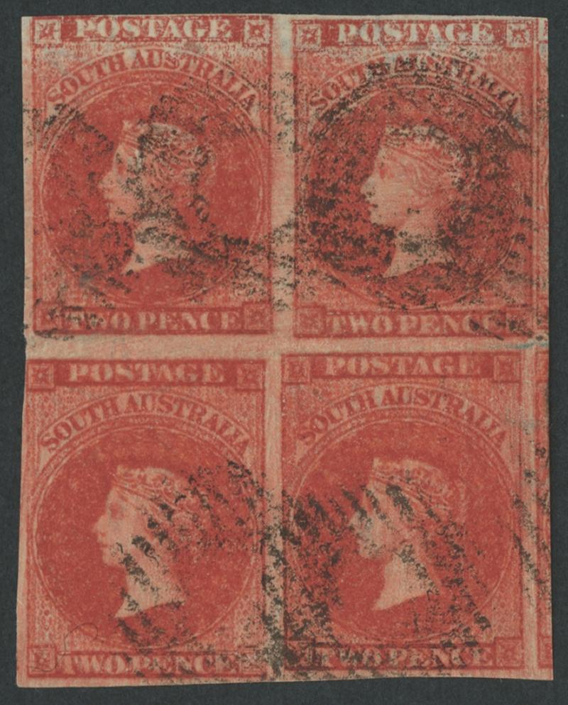 1856-58 QV Perkins Bacon Adelaide Printings Imperforate 2d blood-red SG 8 block of 4, margins just touching - at upper-left - to