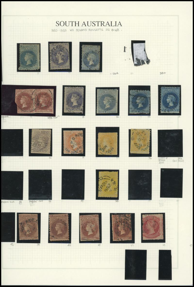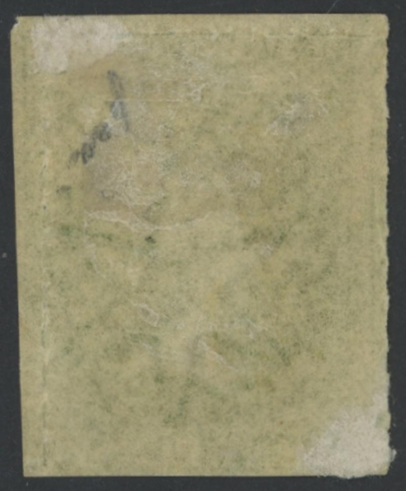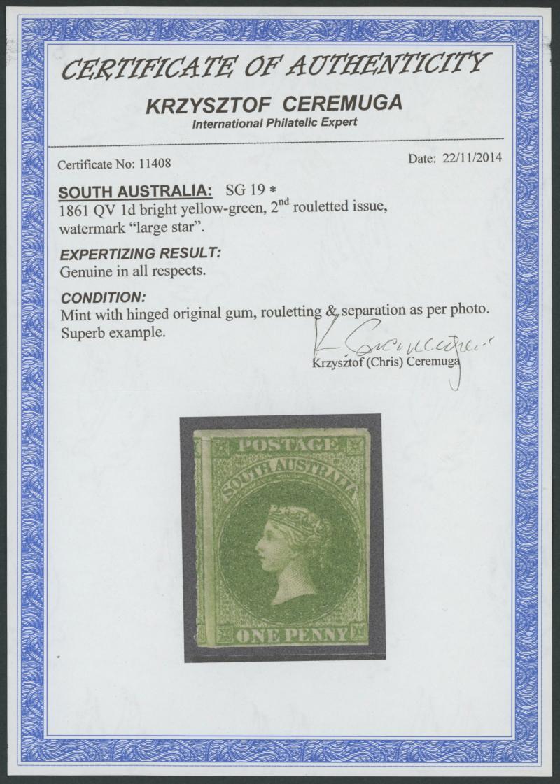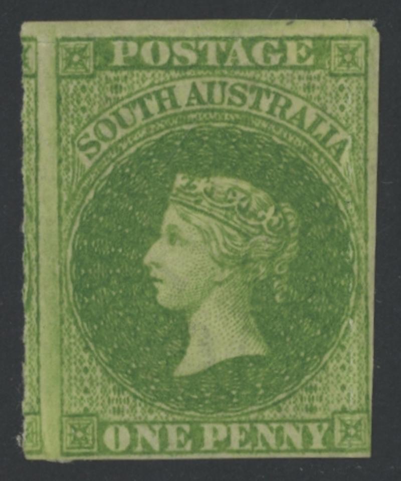 1858-59 QV Perkins Bacon Adelaide Printings First Rouletted Issue 1d yellow-green SG 13, rouletting on all sides cut from the sheet